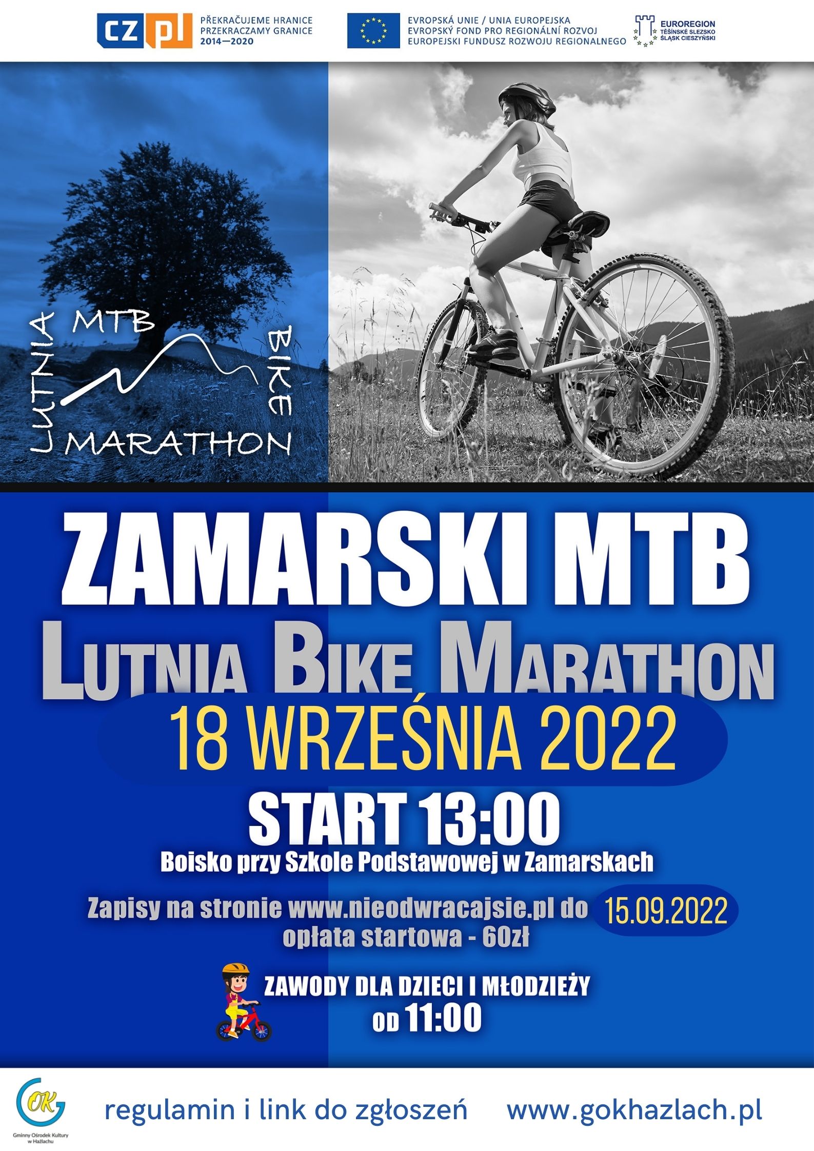 Gminny Ośrodek Kultury w Hażlachu oraz Stowarzyszenie „Lutnia” zapraszają na organizowany 18 września 2022 roku „Zamarski MTB. Lutnia Bike Marathon”. Start o godzinie 13.00 z boiska przy Szkole Podstawowej w Zamarskach. Zawody dla dzieci i młodzieży od godziny 11.00. Zapisy do dnia 15 września 2022 roku na stronie nieodwracajciesie.pl. Opłata startowa 60 zł.