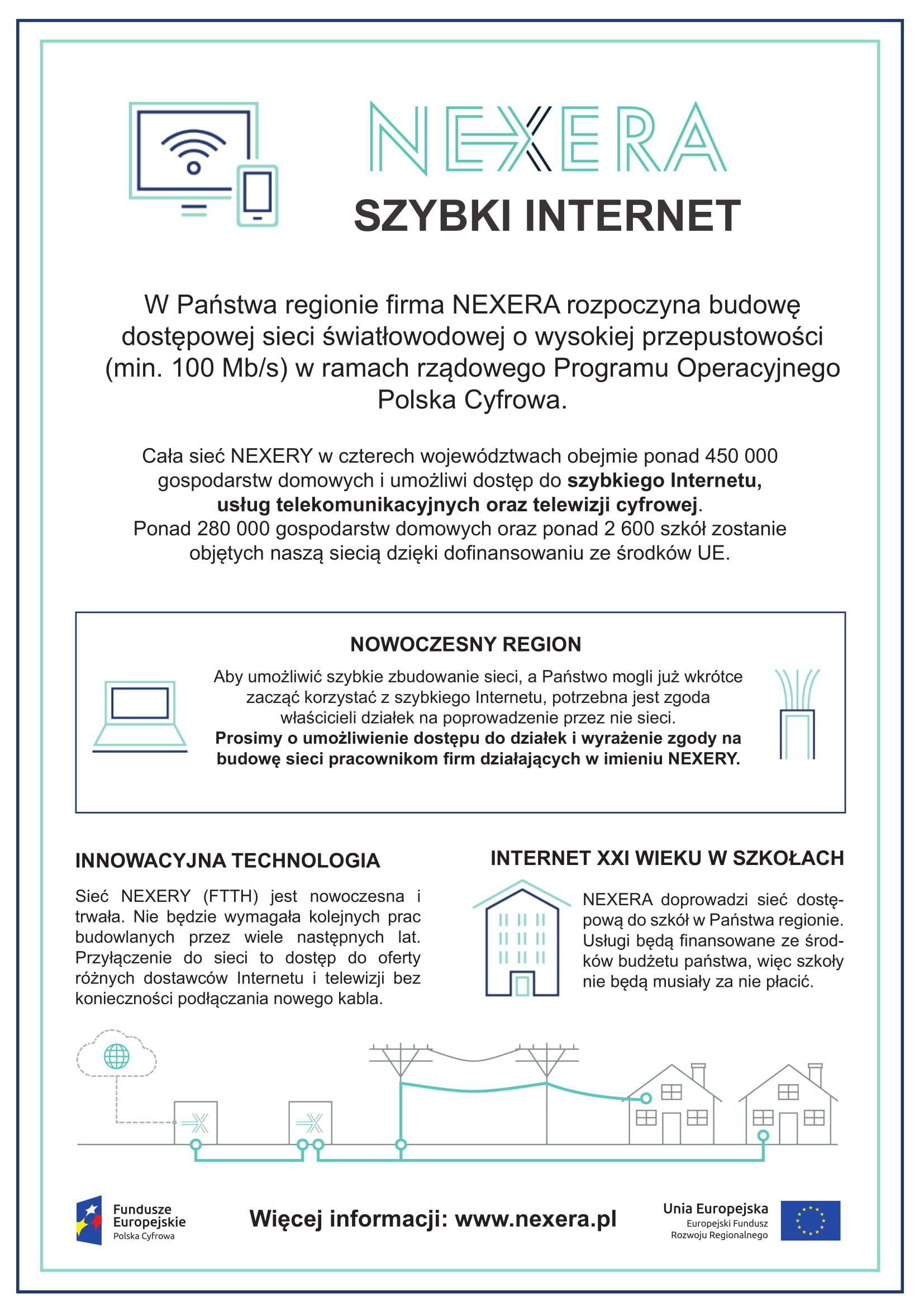Nexera Sp. z o. o. jest w trakcie realizacji projektu budowy sieci światłowodowej w ramach POPC. Projekt zakłada wybudowanie infrastruktury światłowodowej wykorzystując, tam gdzie to możliwe, istniejącą podbudowę słupową (istniejące słupy telekomunikacyjne, jak również energetyczne), czy istniejącą kanalizację teletechniczną. W miejscach, w których brak możliwości wykorzystania istniejącej infrastruktury zakłada się roboty doziemne.