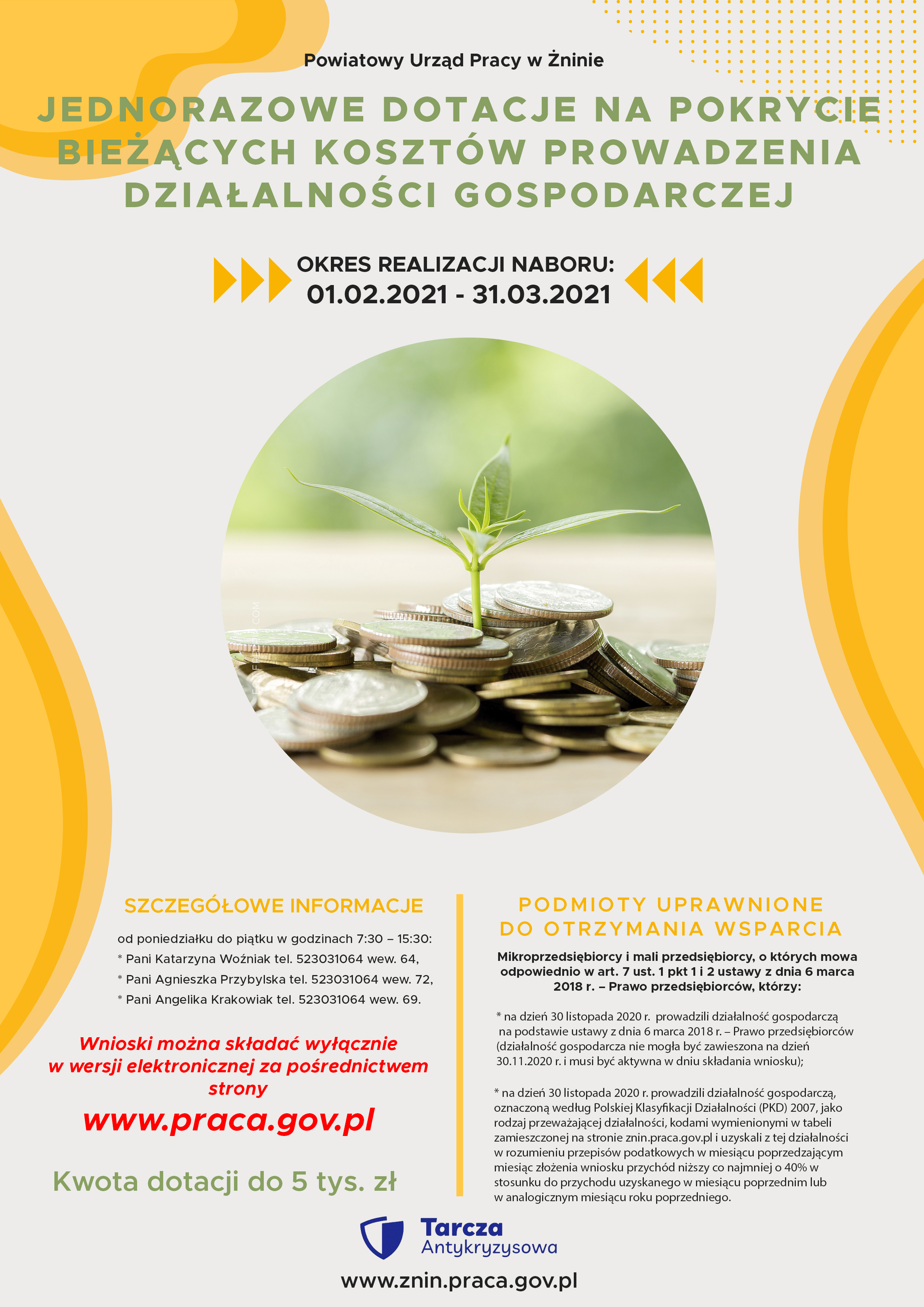 Dyrektor Powiatowego Urzędu Pracy w Żninie ogłosił nabór wniosków dla wybranych firm o udzielenie jednorazowo dotacji z Funduszu Pracy na pokrycie bieżących kosztów prowadzenia działalności gospodarczej mikroprzedsiębiorcy i małego przedsiębiorcy w terminie od 01.02.2021 r. do 31.03.2021 r. (rozdział 3 rozporządzenia Rady Ministrów z dnia 19 stycznia 2021 r. w sprawie wsparcia uczestników obrotu gospodarczego poszkodowanych wskutek pandemii COVID-19 (Dz. U. poz.152), art. 15zze4 ustawy z dnia 2 marca 2020 r. o szczególnych rozwiązaniach związanych z zapobieganiem, przeciwdziałaniem i zwalczaniem COVID-19, innych chorób zakaźnych oraz wywołanych nimi sytuacji kryzysowych (Dz.U. poz. 1842, z późń. zm.)).