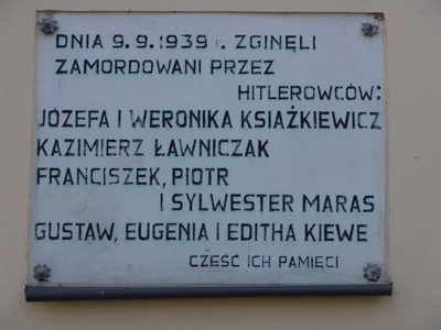 Tablica pamiątkowa rozstrzelenia przez Wermacht 10 Polaków i Żydów w dniu 9 września 1939 r. Na tablicy umieszczono nazwiska 9-ciu zamordowanych |