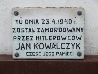 | Dnia 23 kwietnia 1940 r.- miejscowi Niemcy zastrzelili na pobliskim moście 17 letniego chłopca Jana Kowalczyka upamiętniono tablicą | ||||