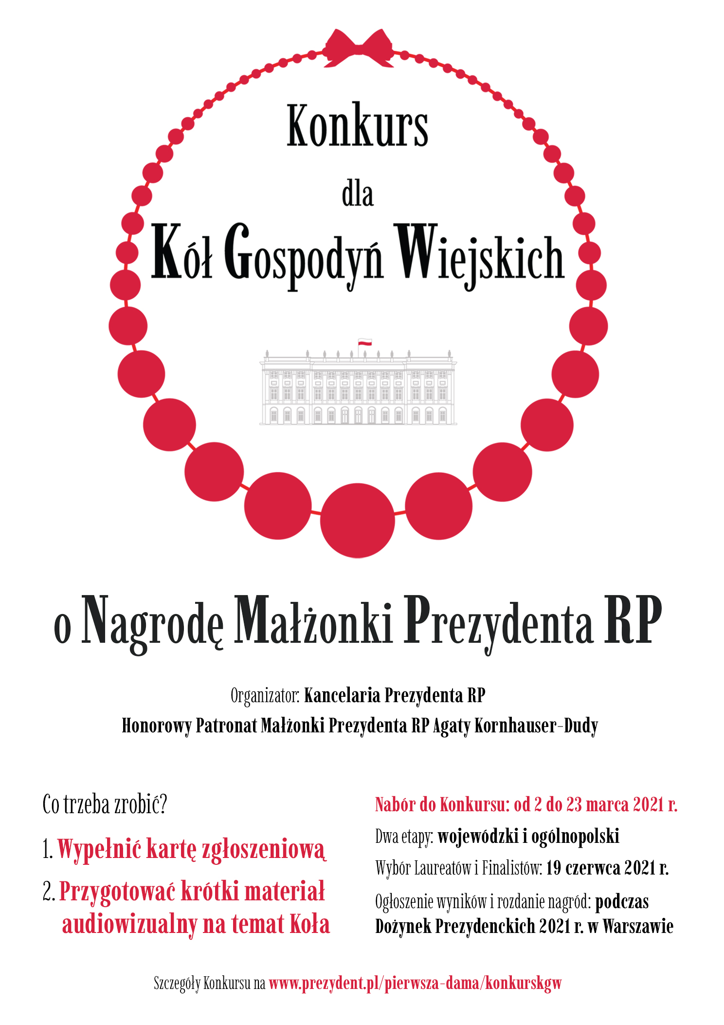 Regulamin Konkursu dla Kół Gospodyń Wiejskich o Nagrodę Małżonki Prezydenta RPRegulamin_Konkursu_dla_Kół_Gospodyń_Wiejskich_o_Nagrodę_Małżonki_Prezydenta_RP.pdf 6.40MB Szczegóły Konkursu na www.prezydent.pl/pierwsza-dama/konkurskgw/