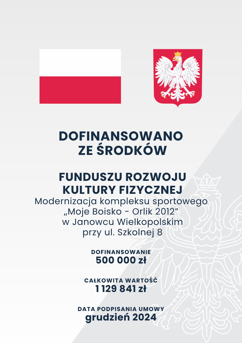 W dniu 11 grudnia 2024 r. Gmina Janowiec Wielkopolski podpisała umowę Nr 2024/0471/2885/SubA/DIS/MKSO o dofinansowanie ze środków Funduszu Rozwoju Kultury Fizycznej Zadania Inwestycyjnego w ramach Programu Modernizacji Kompleksów Sportowych „MOJE BOISKO – ORLIK 2012” – EDYCJA 2024.