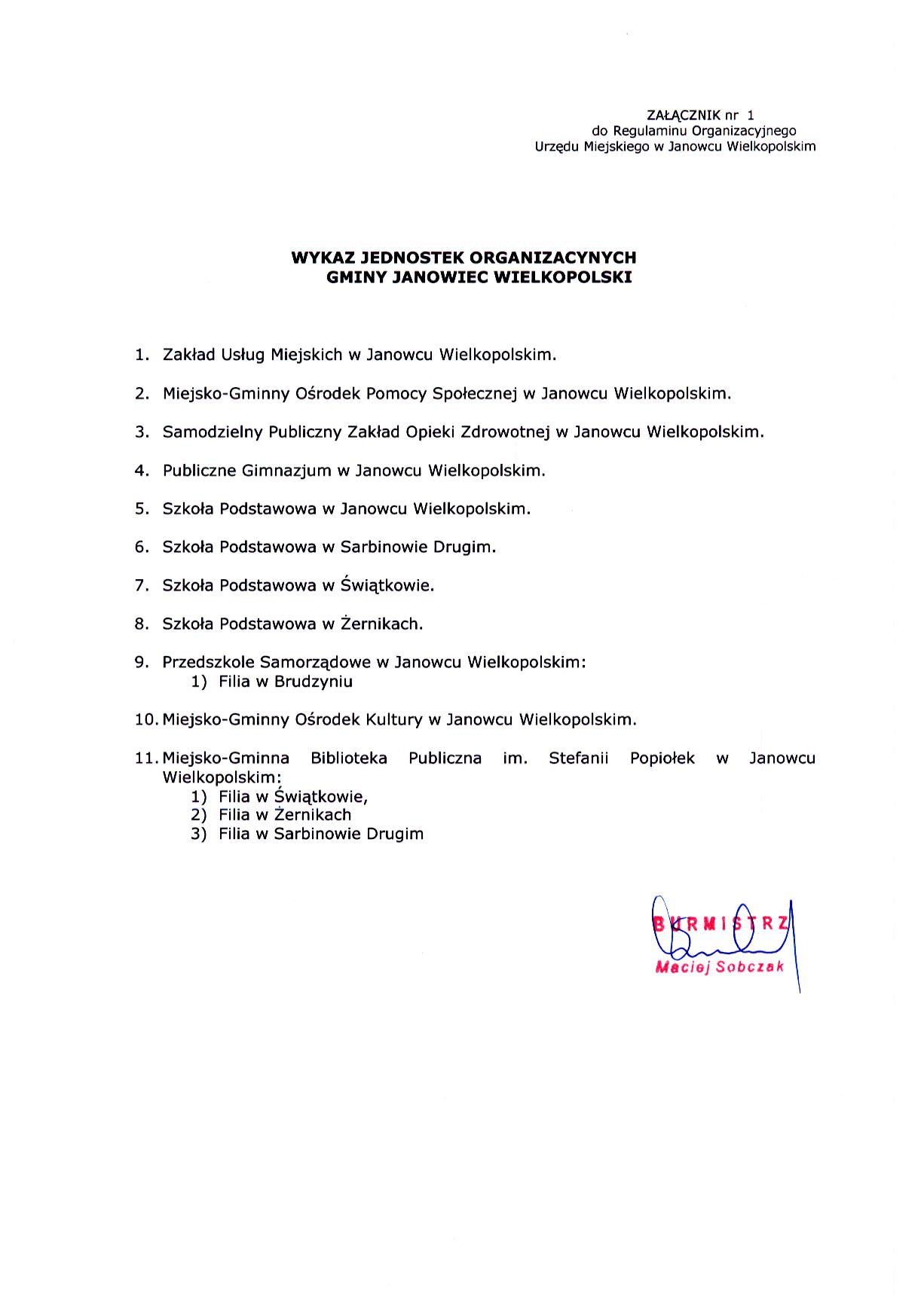 | Regulamin Organizacyjny Urzędu Miejskiego w Janowcu Wielkopolskim | 1.0 | 12.10.2021 08:32 Łukasz Maciejewski |