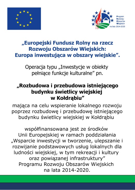 Operacja typu „Inwestycje w obiekty pełniące funkcje kulturalne” pn. „Rozbudowa i przebudowa istniejącego budynku świetlicy wiejskiej w Kołdrąbiu” mająca na celu wspieranie lokalnego rozwoju poprzez rozbudowę i przebudowę istniejącego budynku świetlicy wiejskiej w Kołdrąbiu współfinansowana jest ze środków Unii Europejskiej w ramach poddziałania „Wsparcie inwestycji w tworzenie, ulepszanie i rozwijanie podstawowych usług lokalnych dla ludności wiejskiej, w tym rekreacji i kultury oraz powiązanej infrastruktury” Programu Rozwoju Obszarów Wiejskich na lata 2014-2020.