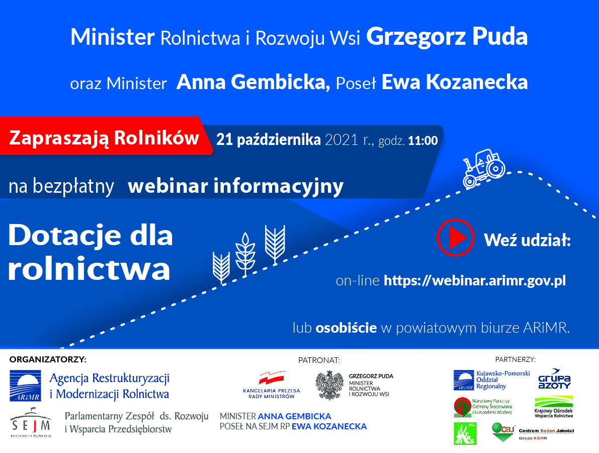 W czwartek 21 października br. odbędzie się webinarium pn.: „Dotacje dla rolnictwa”, którego rozpoczęcie planowane jest na godzinę 11:00.