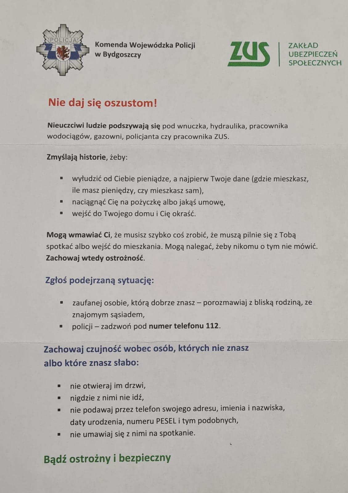 W 2018 roku Prezes Zakładu Ubezpieczeń Społecznych prof. Gertruda Uścińska i Komendant Głównym Policji nadinsp. Jarosław Szymczyk podpisali porozumienie o współpracy w zakresie przeciwdziałania zagrożeniom bezpieczeństwa obywateli. Ulotka to jeden z wymiernych efektów tego porozumienia.
