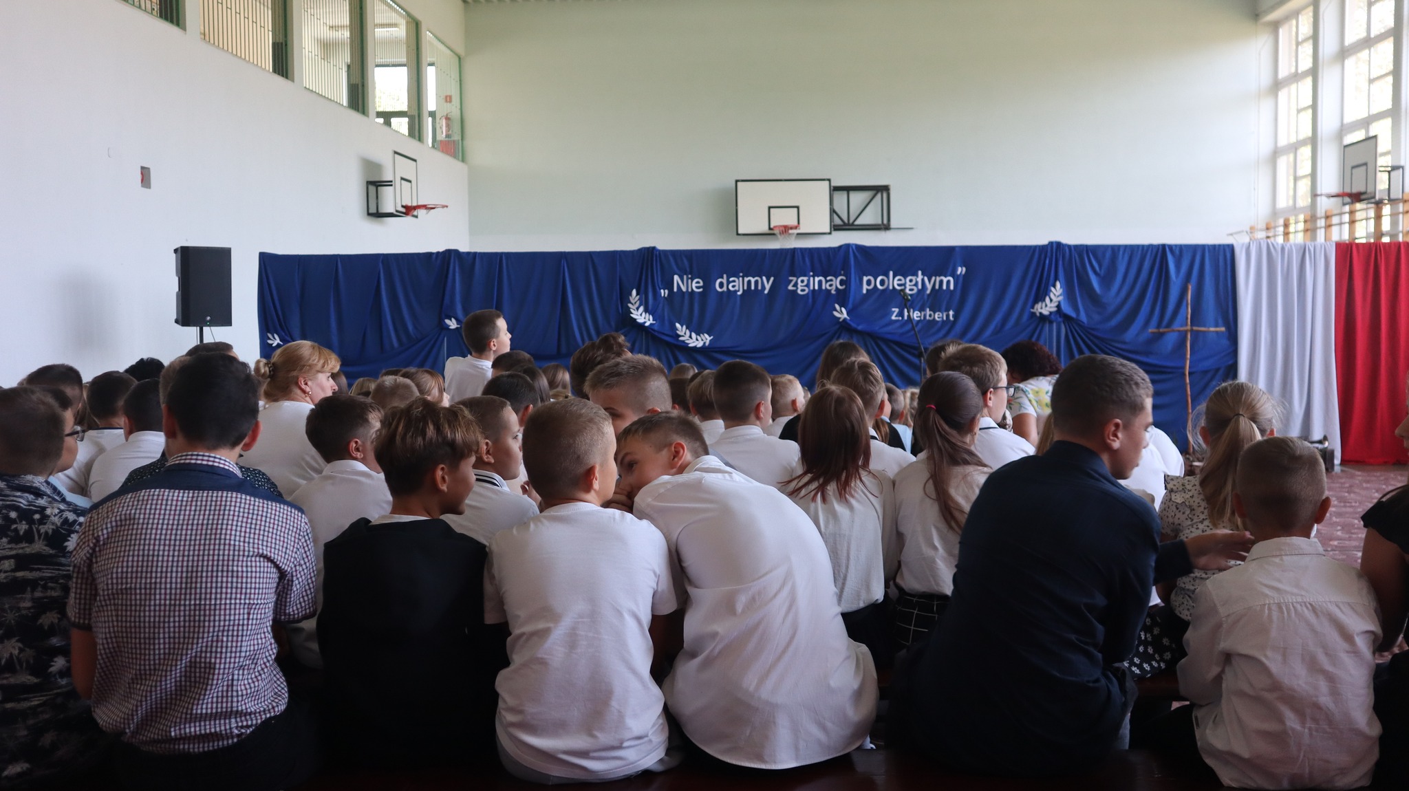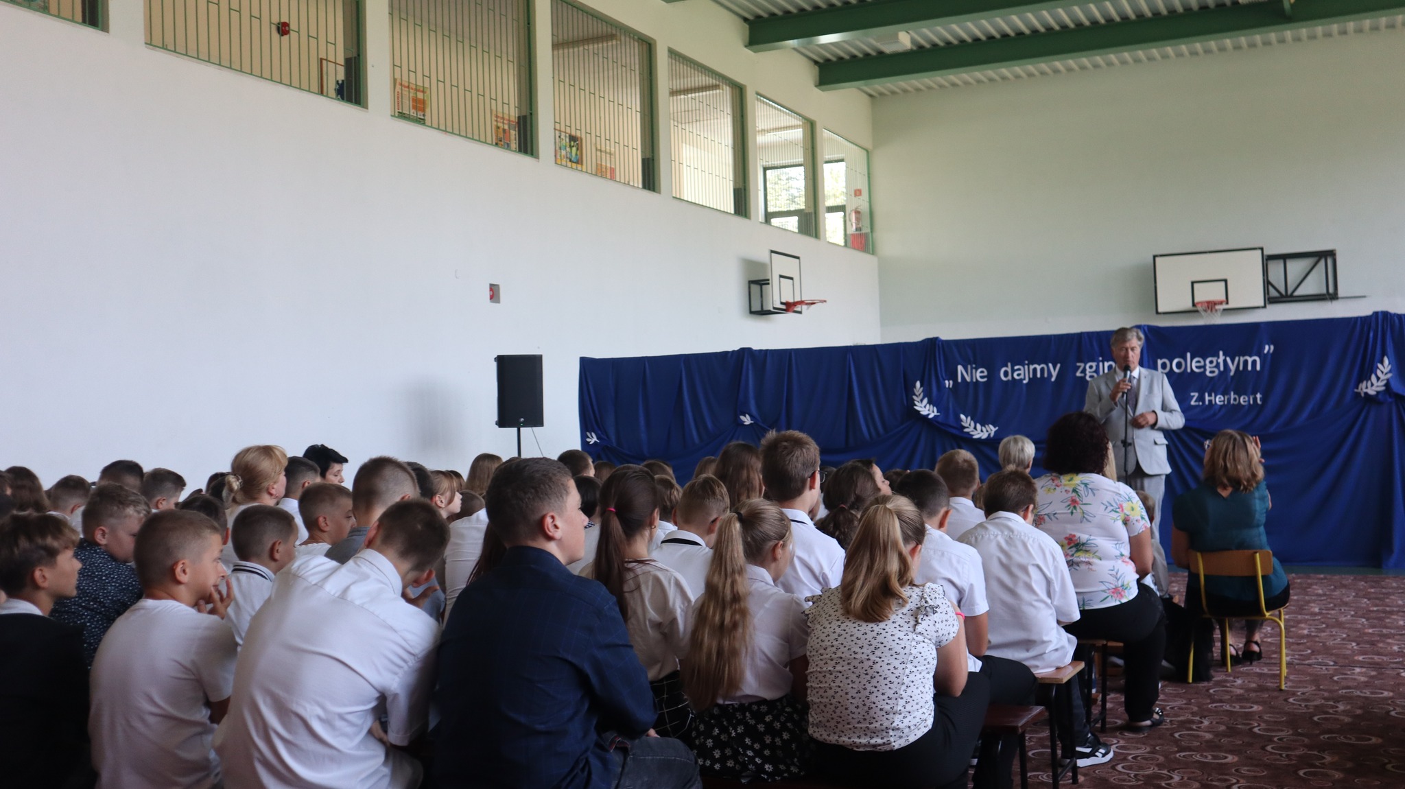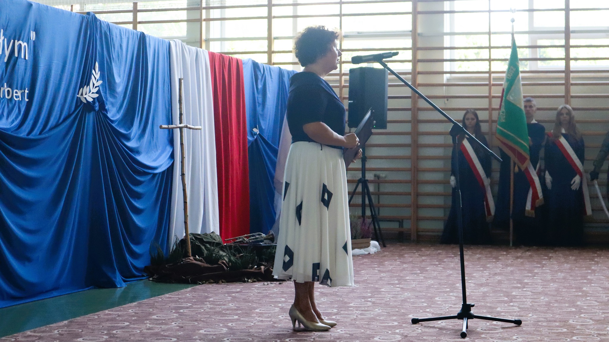 Uroczystość rozpoczęło wprowadzenie sztandarów i wspólne odśpiewanie hymnu państwowego. Następnie pani dyrektor Renata Lechowska powitała zebranych i wygłosiła kilka refleksji na temat potrzeby pielęgnowania pamięci o minionych wydarzeniach i ludziach.