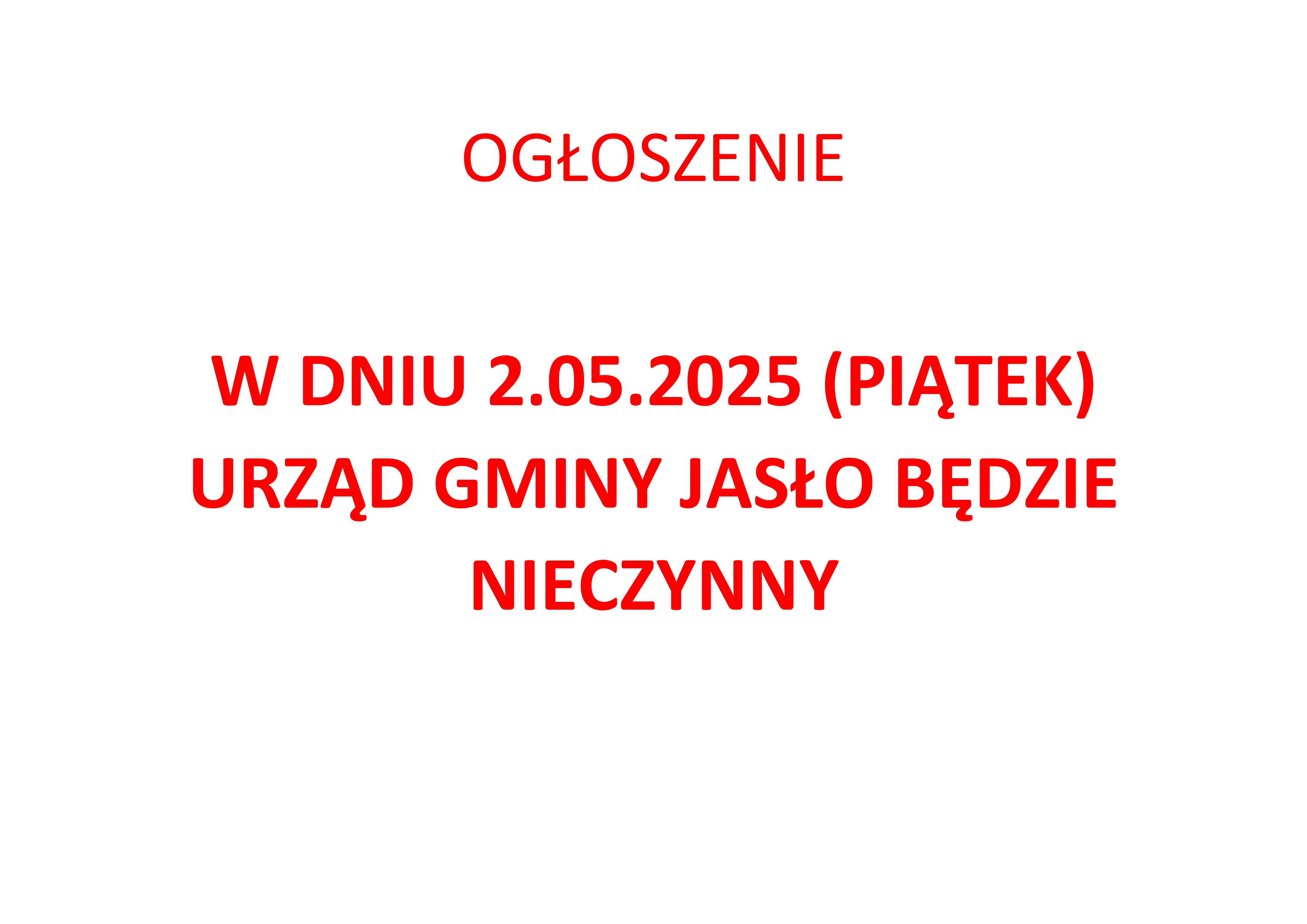 W dniu 2 maja 2025 roku Urząd Gminy Jasło będzie nieczynny.