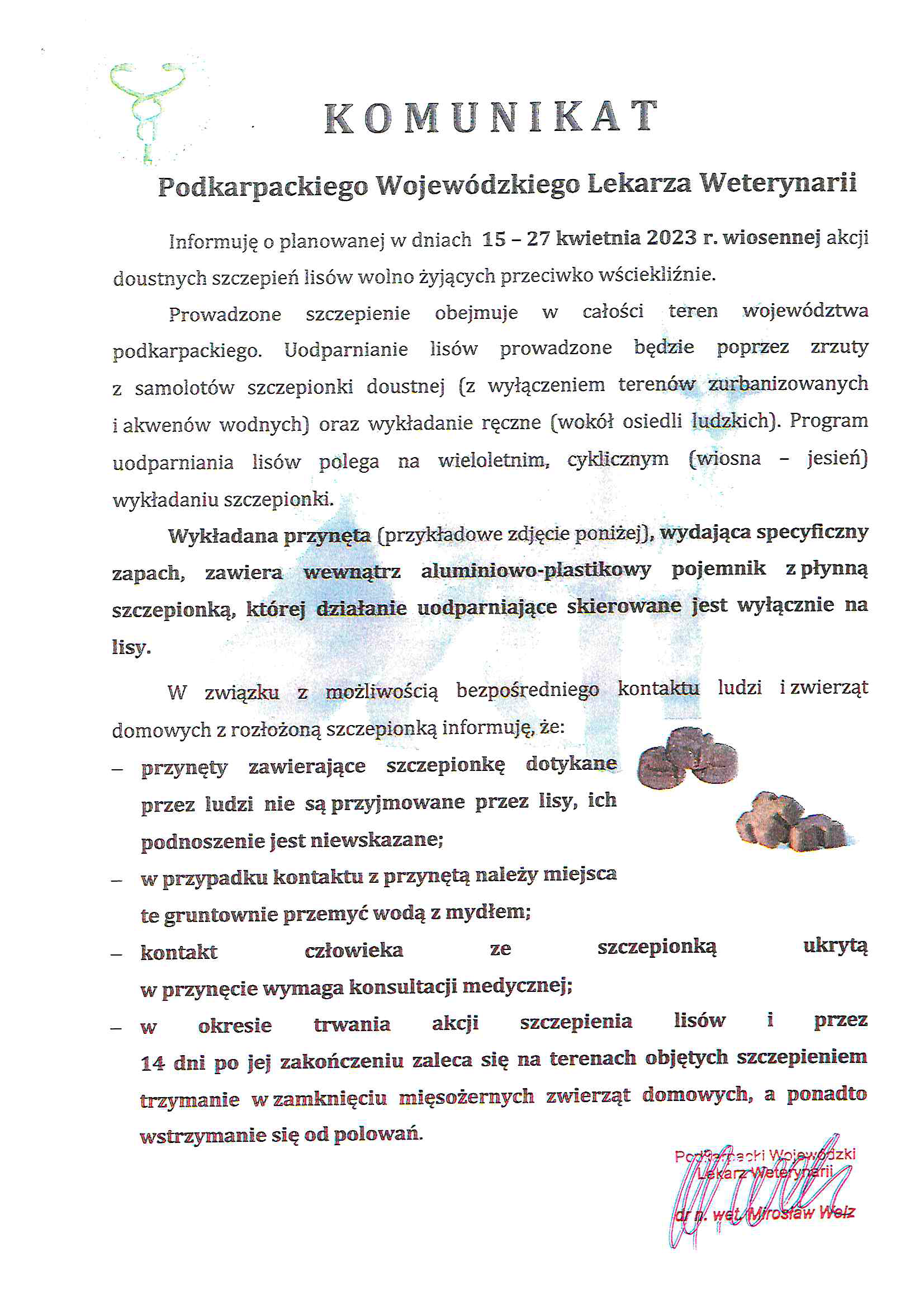 Akcja doustnych szczepień lisów wolno żyjących przeciwko wściekliźnie (kwiecień 2023 r.)komunikat-wiosenna-akcja-szczepienia-lisow-przeciwko-wsciekliznie.pdf 0.26MB