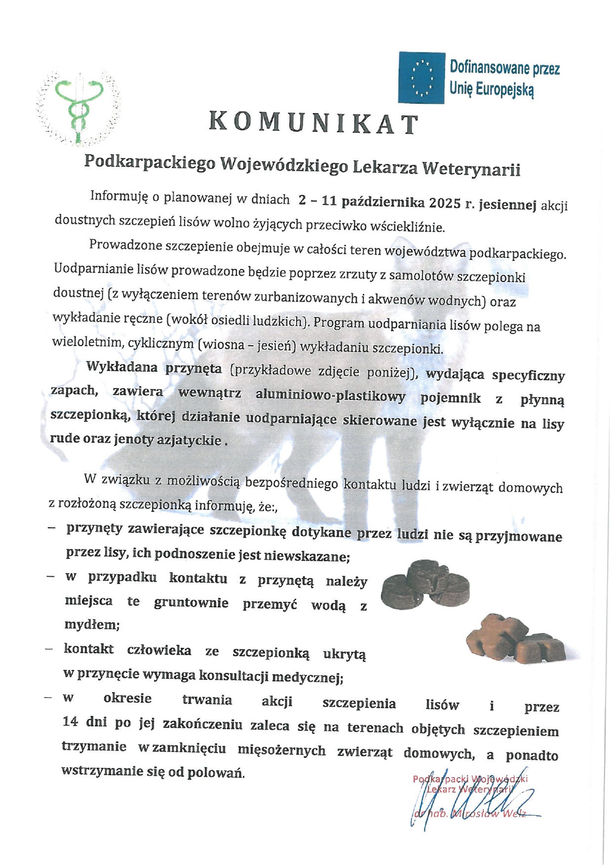 Akcja doustnych szczepień lisów wolno żyjących przeciwko wściekliźnie (październik 2025 r.)akcja_szczepienia_lisów_pazdziernik_2025.pdf 0.43MB