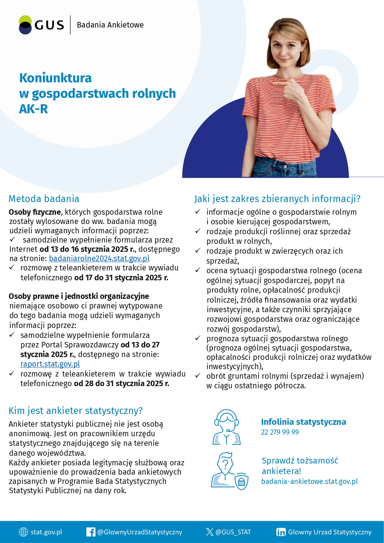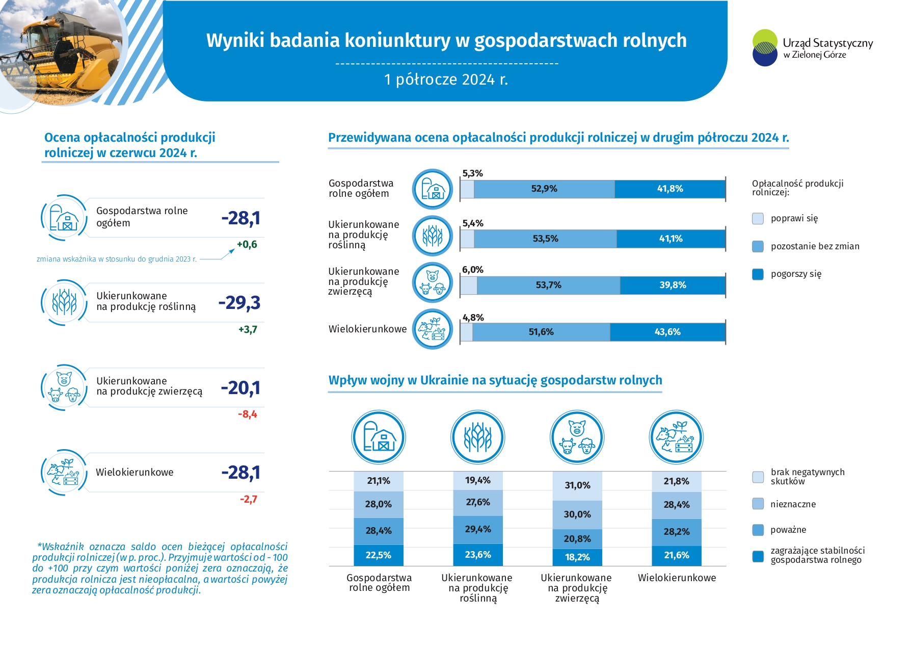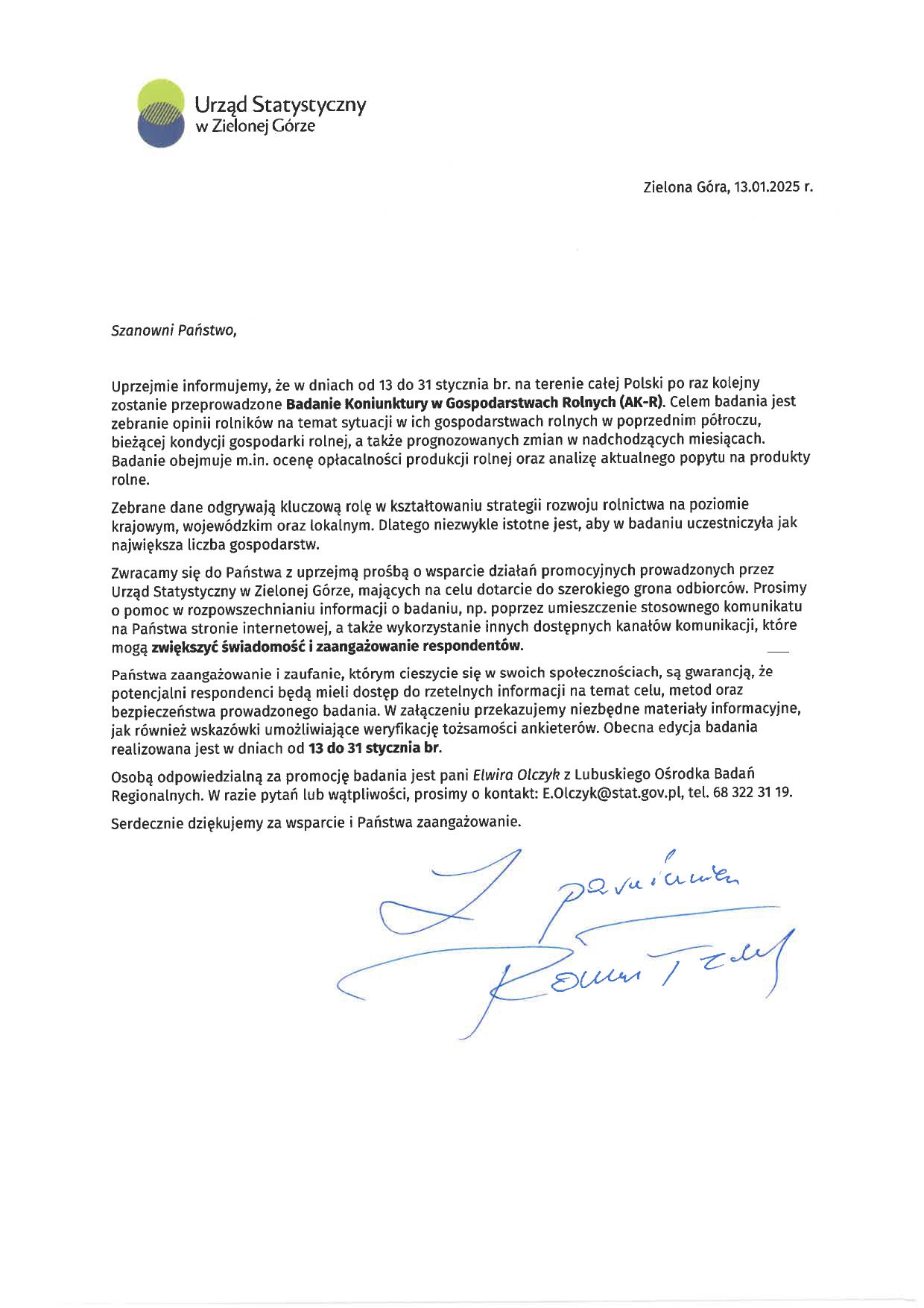 Urząd Statystyczny w Zielonej Górze informuje, że od 13 do 31 stycznia br. na terenie całej Polski po raz kolejny zostanie przeprowadzone Badanie Koniunktury w Gospodarstwach Rolnych (AK-R). Celem badania jest zebranie opinii rolników na temat sytuacji w ich gospodarstwach rolnych w poprzednim półroczu, bieżącej kondycji gospodarki rolnej, a także prognozowanych zmian w nadchodzących miesiącach.
