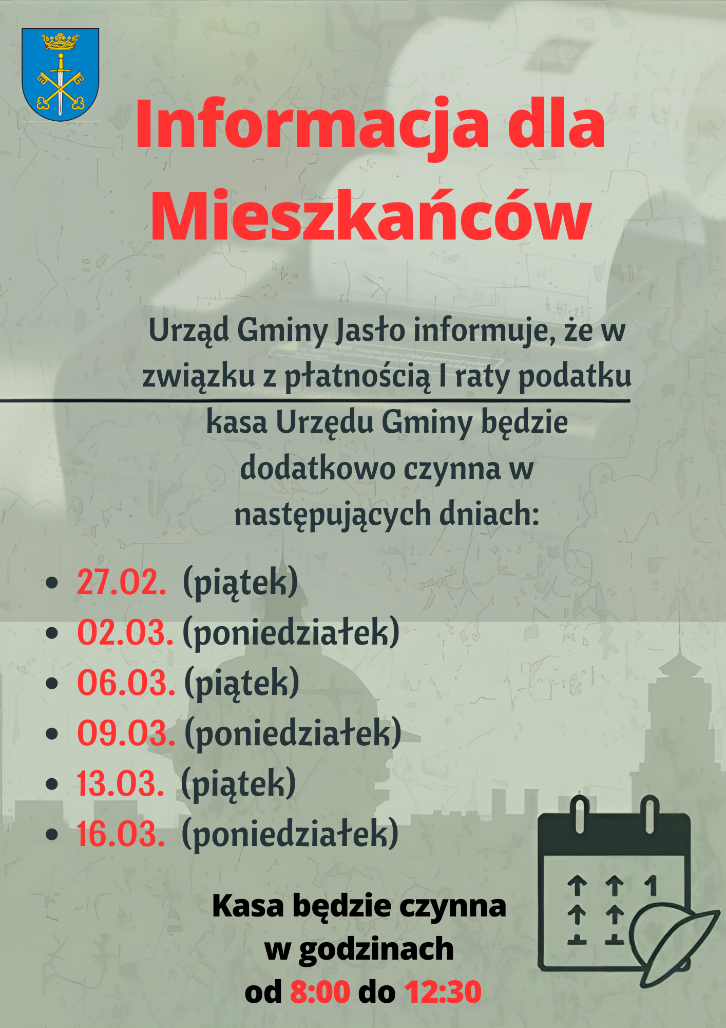 Urząd Gminy Jasło informuje ze w związku z płatnością I raty podatku kasa urzędu Gminy będzie dodatkowo czynna w dniach: