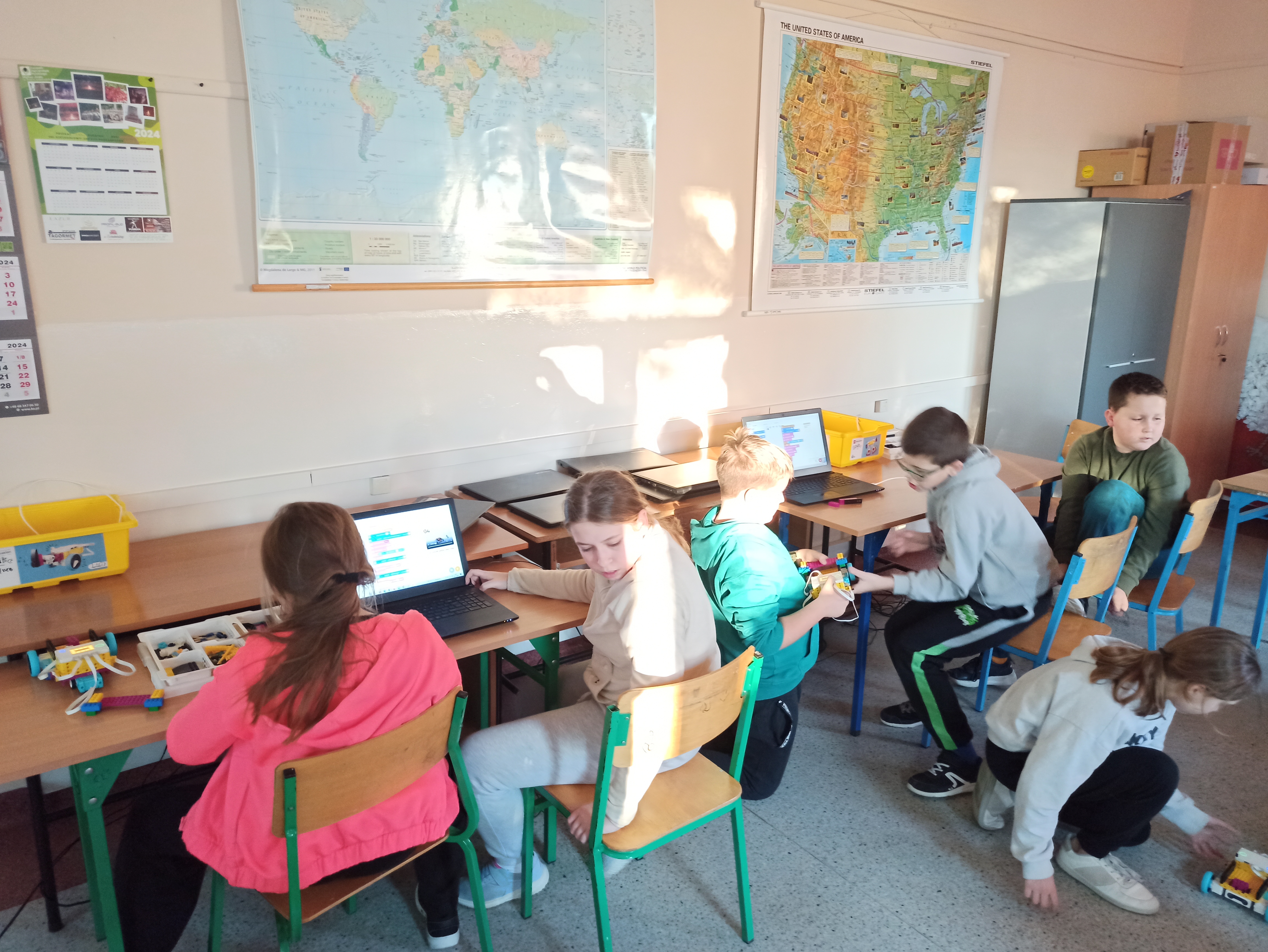 - Na zajęciach „szkolnego klubu kodowania” uczniowie uczą się programowania blokowego z wykorzystaniem zestawów klocków Lego. Zajęcia odbywają się w zespołach dwu- lub trzyosobowych. Po wykonaniu i zaprogramowaniu robota sprawdzamy jak działa, wprowadzamy ewentualne poprawki i testujemy wprowadzone modyfikacje.