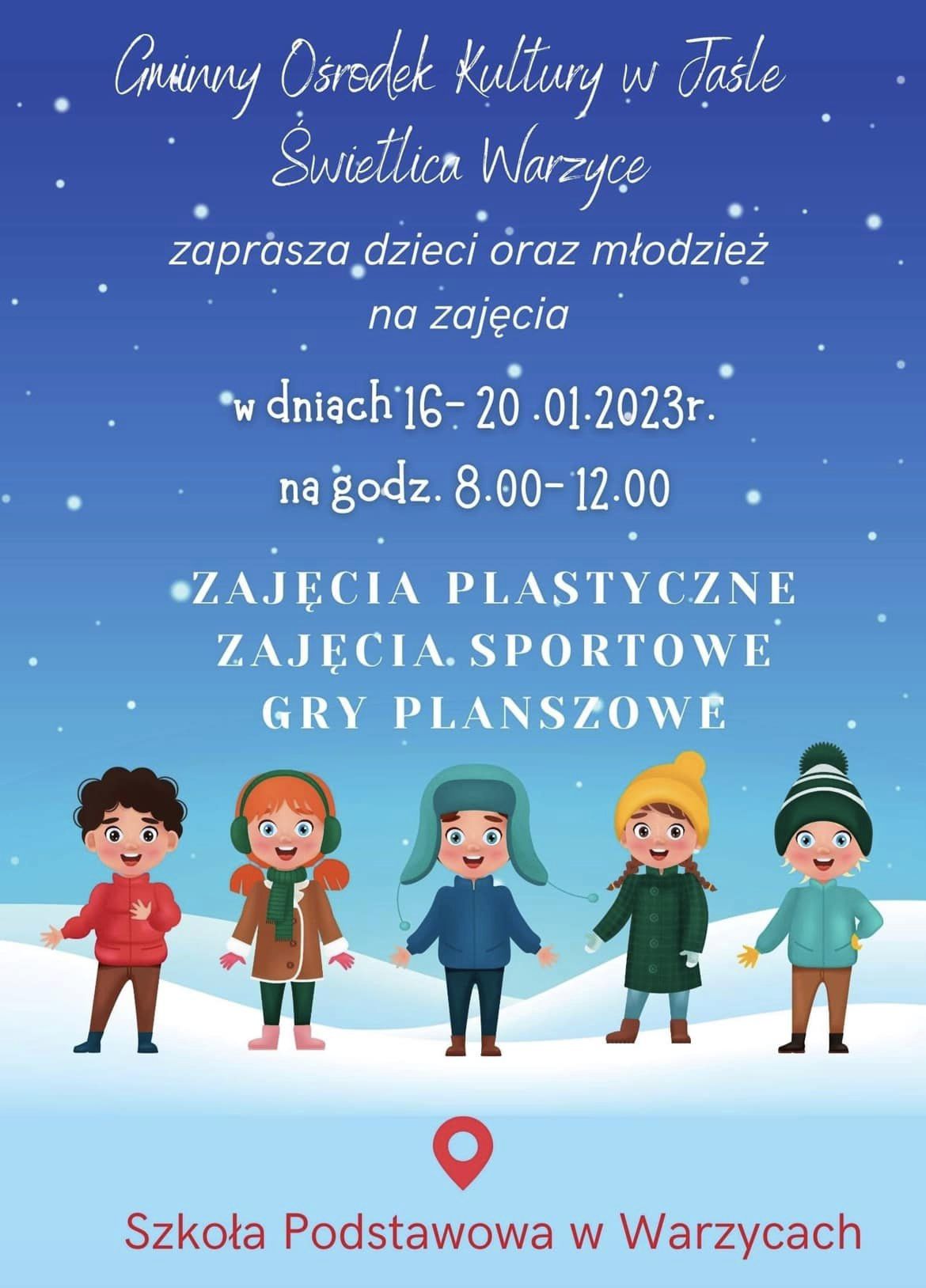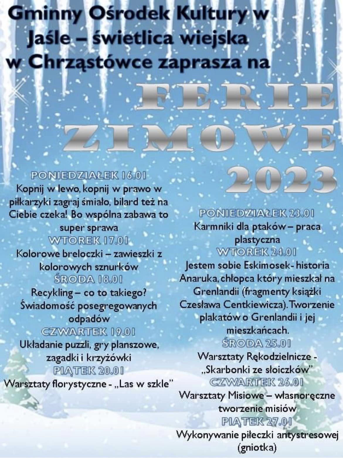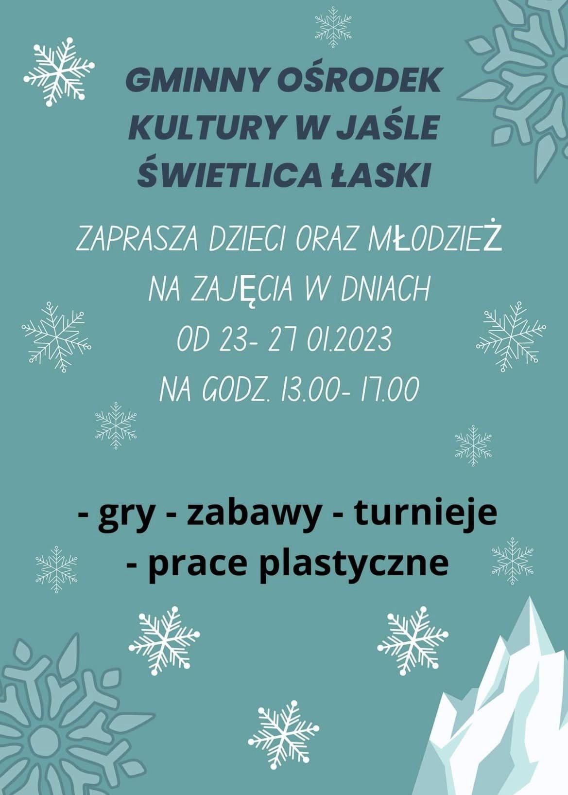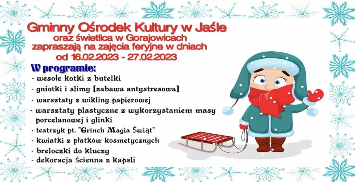 Gminny Ośrodek Kultury w Jaśle zaprasza dzieci na ferie zimowe w świetlicach.