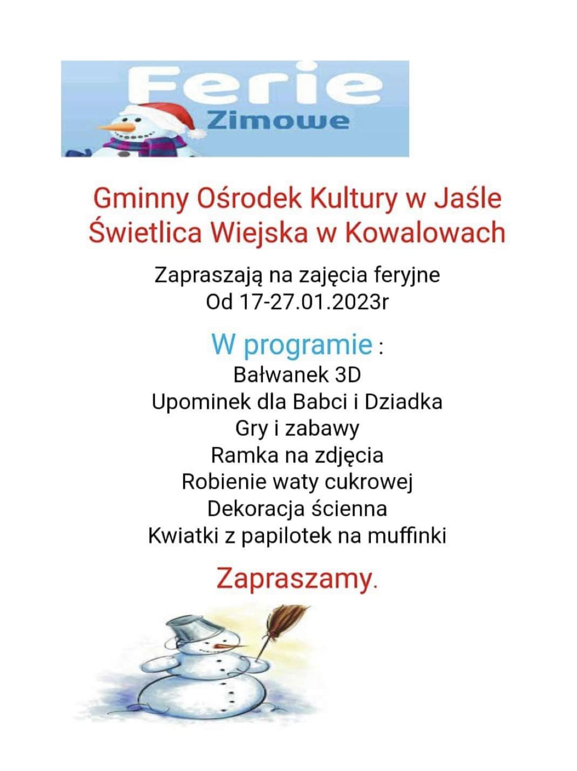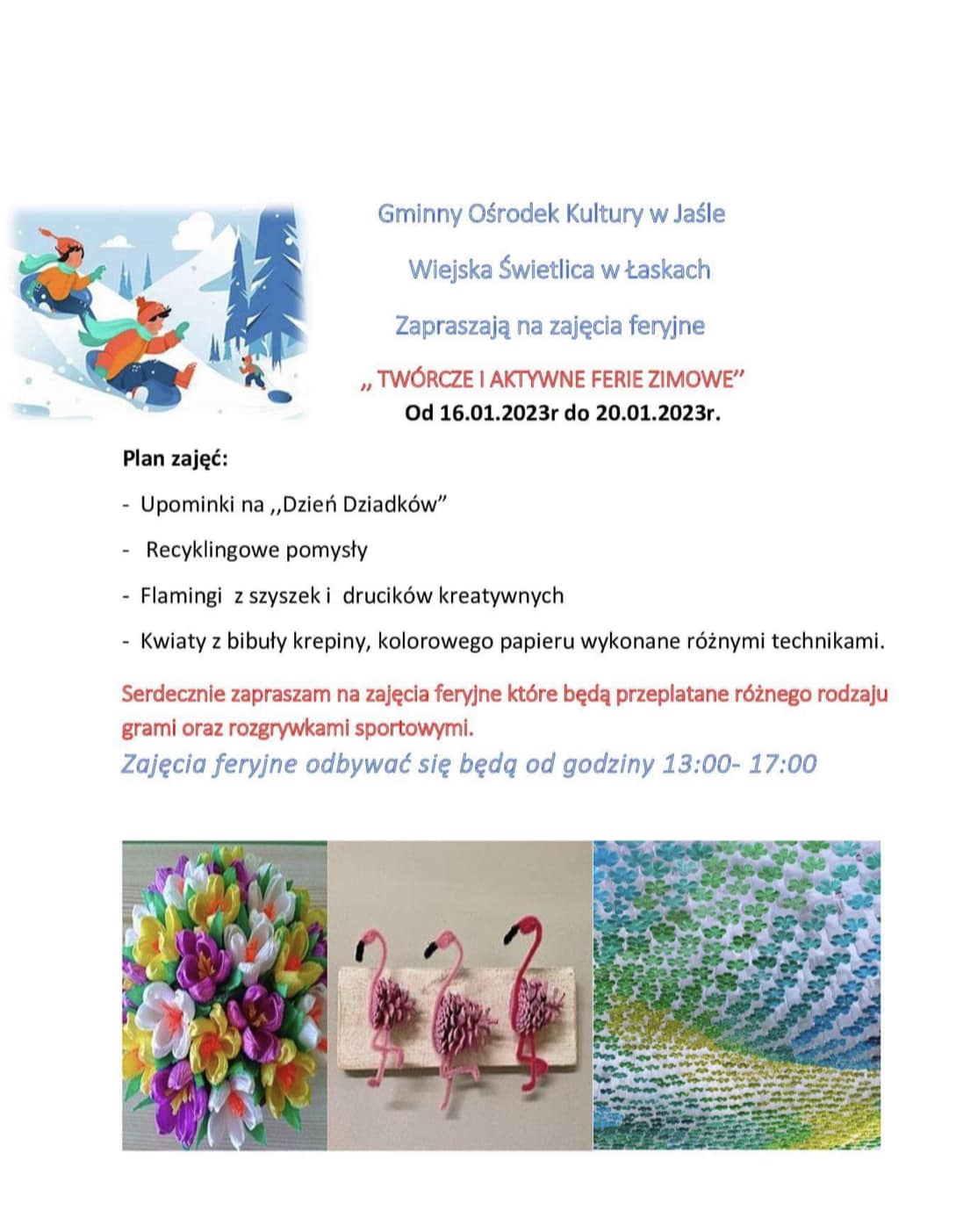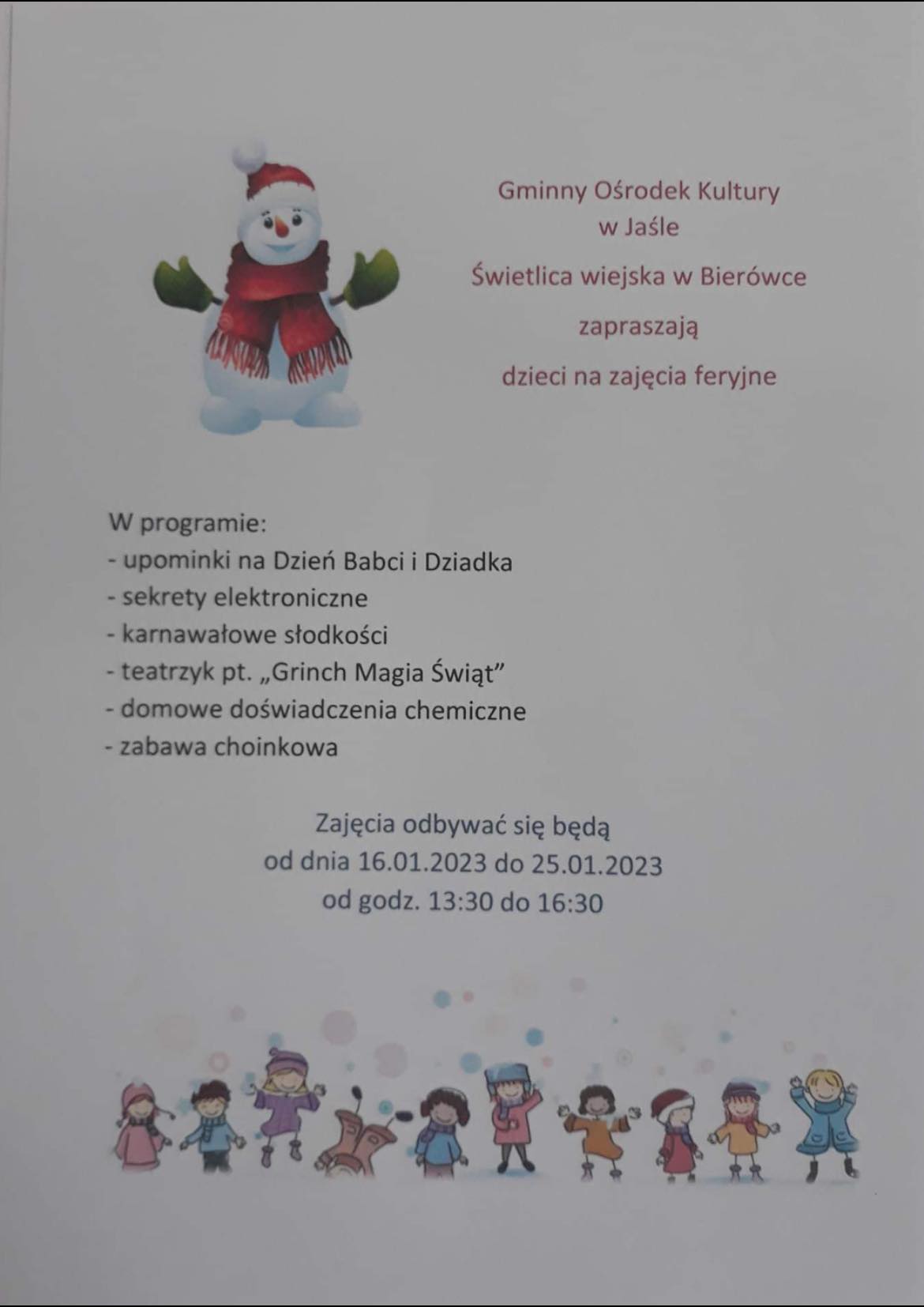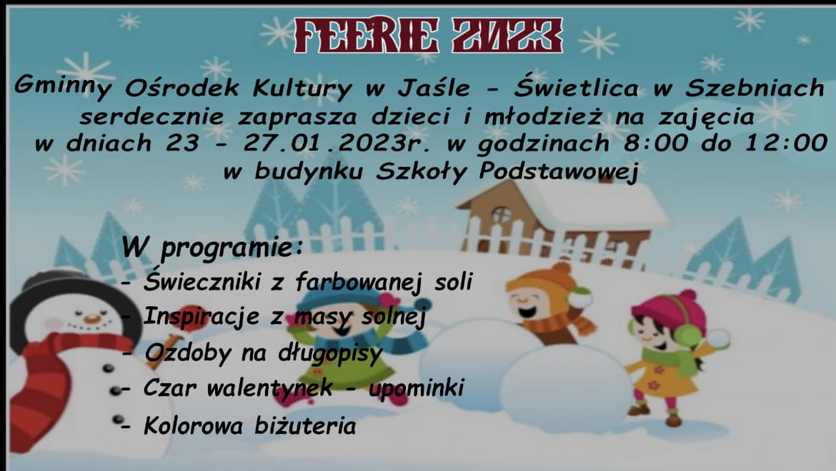 Gminny Ośrodek Kultury w Jaśle zaprasza dzieci na ferie zimowe w świetlicach.