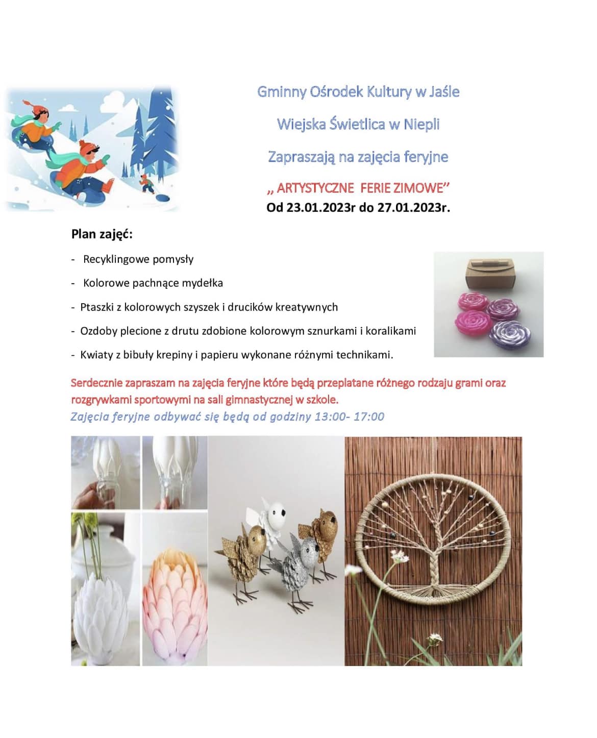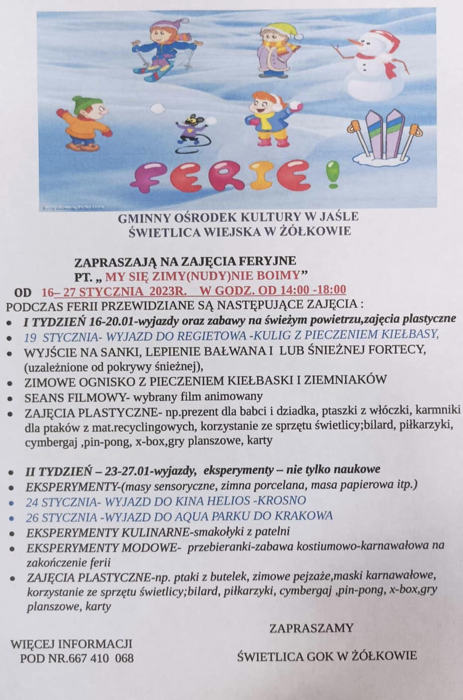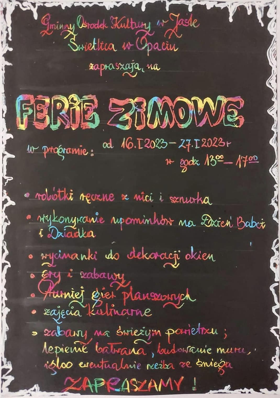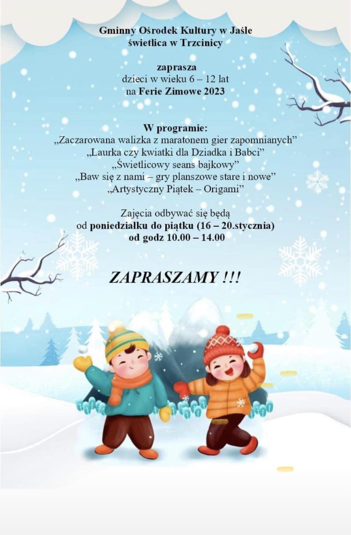 Gminny Ośrodek Kultury w Jaśle zaprasza dzieci na ferie zimowe w świetlicach.