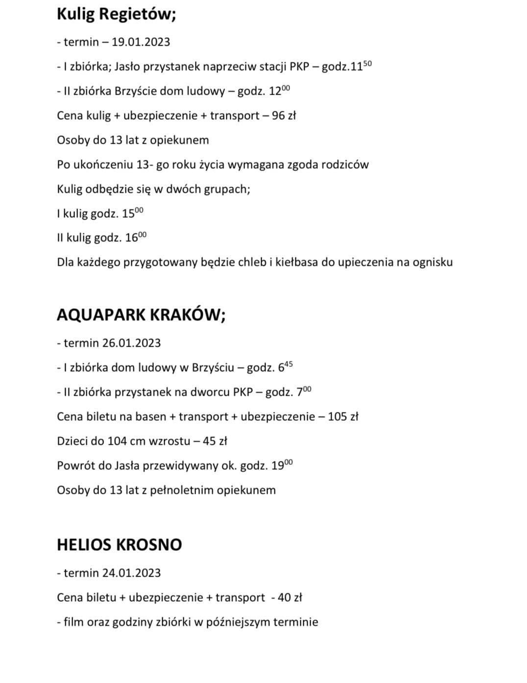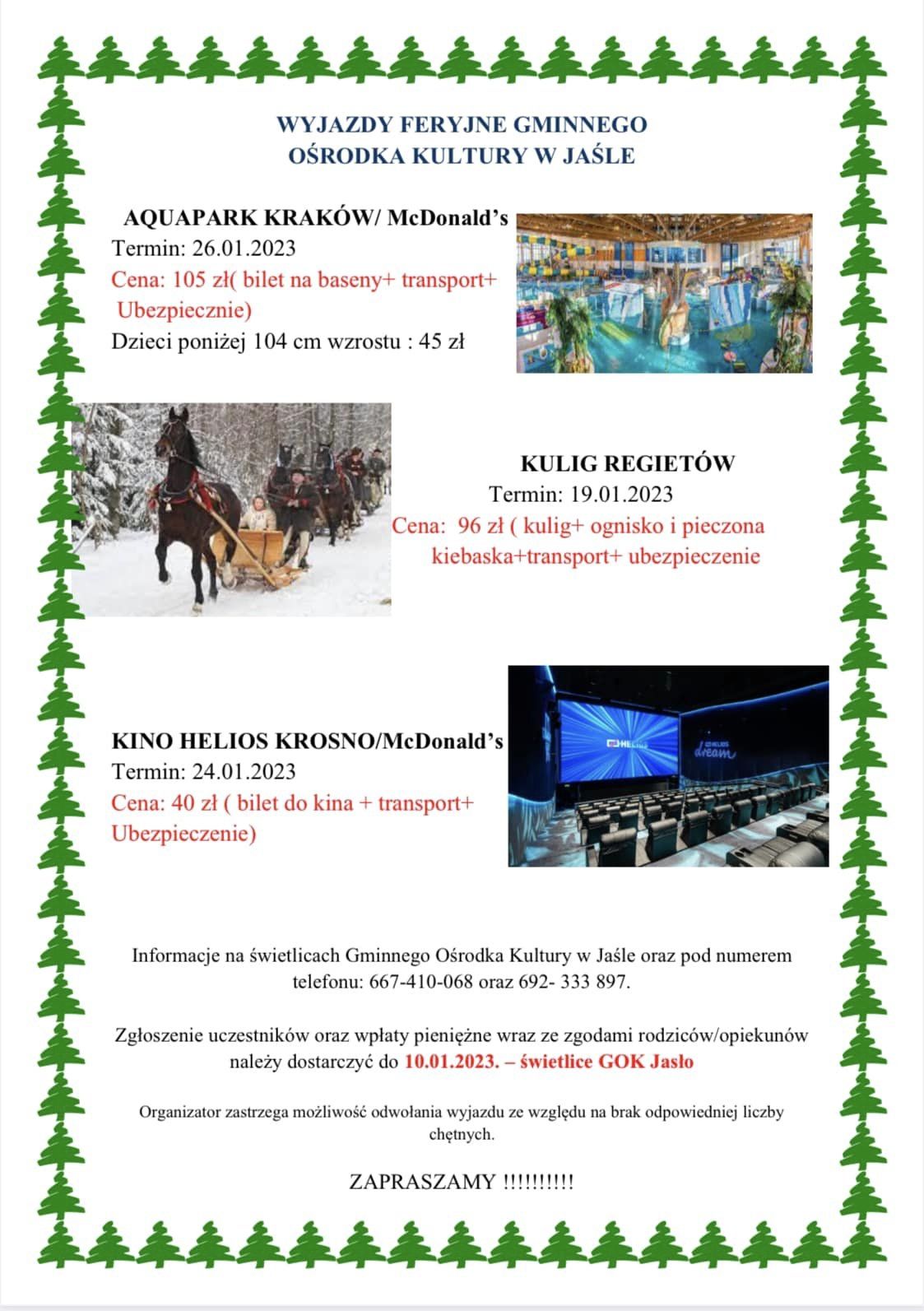 Zapraszamy na wyjazd do Aquaparku Kraków, Kina Helios i Regietiowa na kulig.