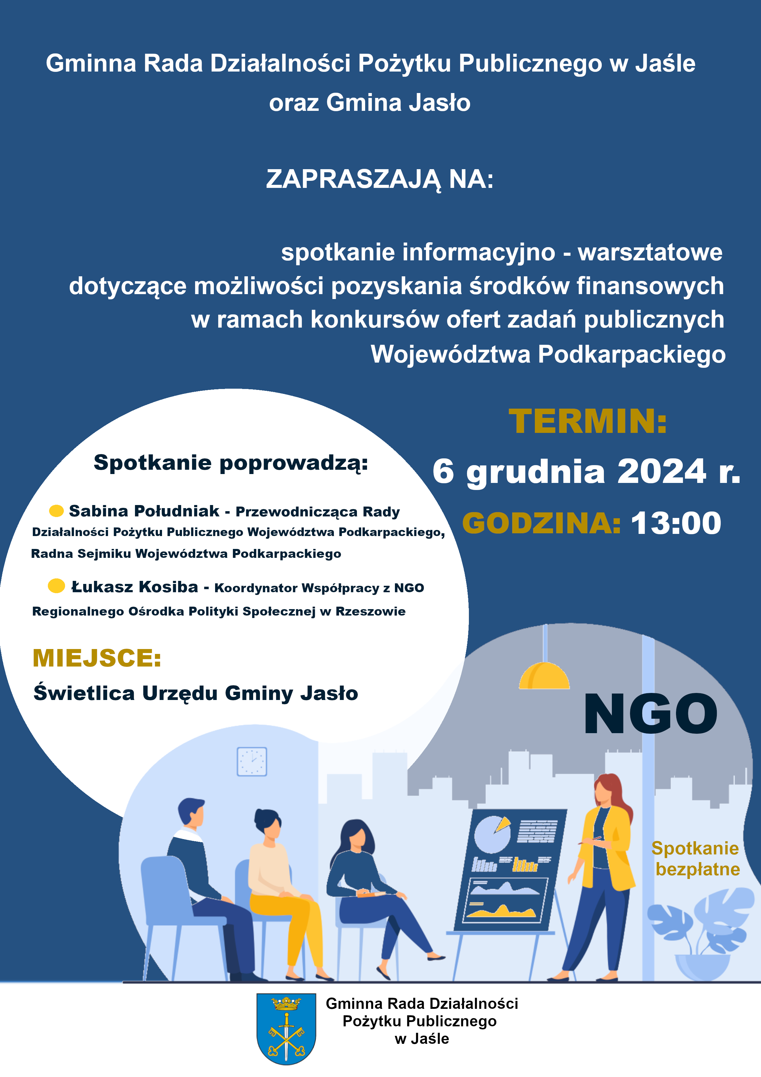 Gminna Rada Działalności Pożytku Publicznego w Jaśle oraz Gmina Jasło zapraszają na spotkanie informacyjno-warsztatowe dotyczące pozyskania środków finansowych