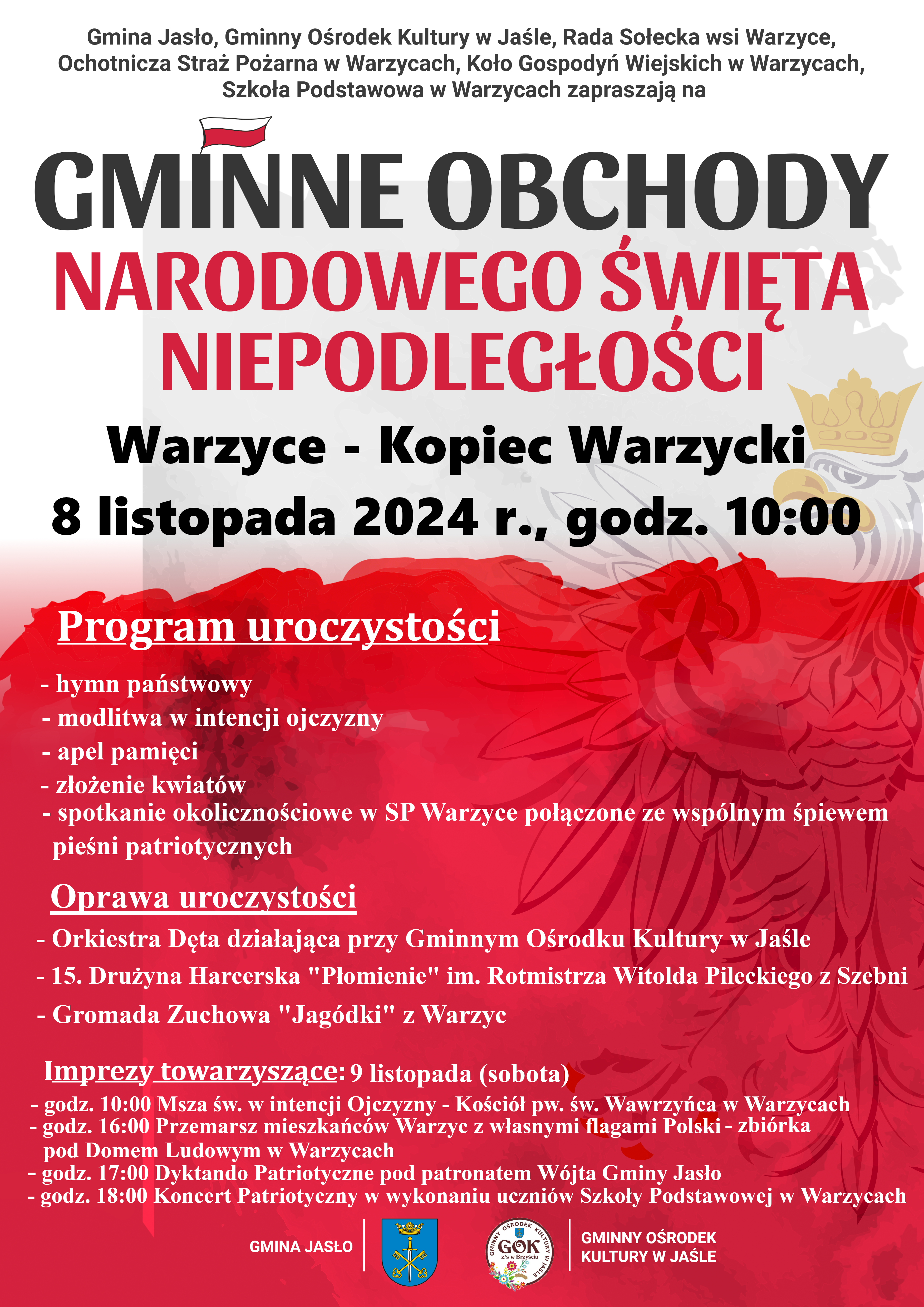 Gminne Obchody Narodowego Święta Niepodległości 8 listopada 2024 r. godz. 10:00 Warzyce - Kopiec Warzycki