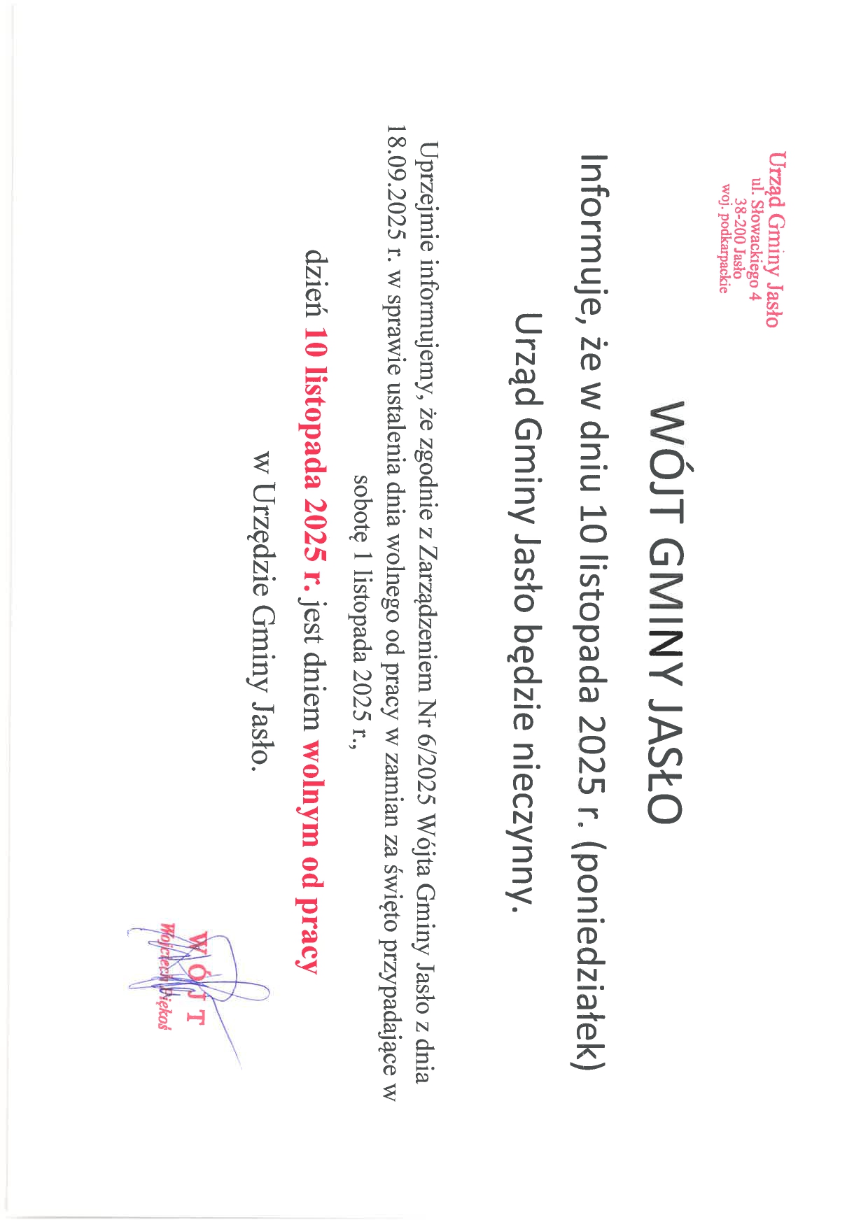 Zgodnie z Zarządzeniem Nr 6/2025 Wójta Gminy Jasło z dnia 18.09.2025 r. w sprawie ustalenia dnia wolnego od pracy w zamian za święto przypadające w sobotę 1 listopada 2025 r., dzień 10 listopada 2025 r. jest dniem wolnym od pracy w Urzędzie Gminy Jasło.