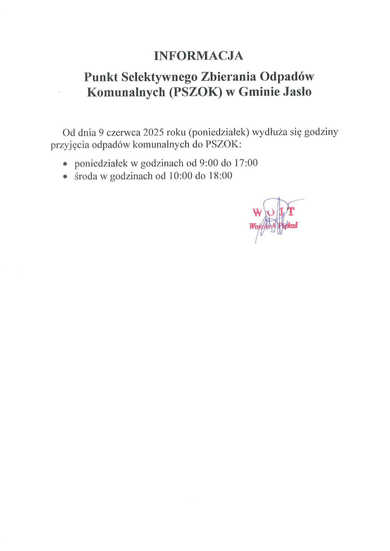 Informacja o dłuższych godzinach pracy Punktu Selektywnego Zbierania Odpadów Komunalnych w Gminie Jasło