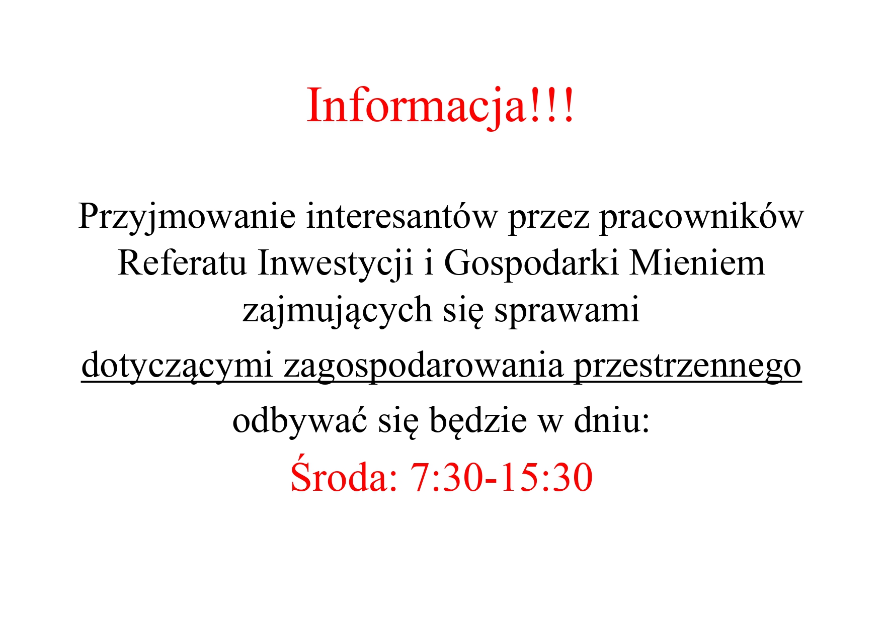 Informacja o przyjmowaniu interesantów przez pracowników Referatu Inwestycji i Gospodarki Mieniem
