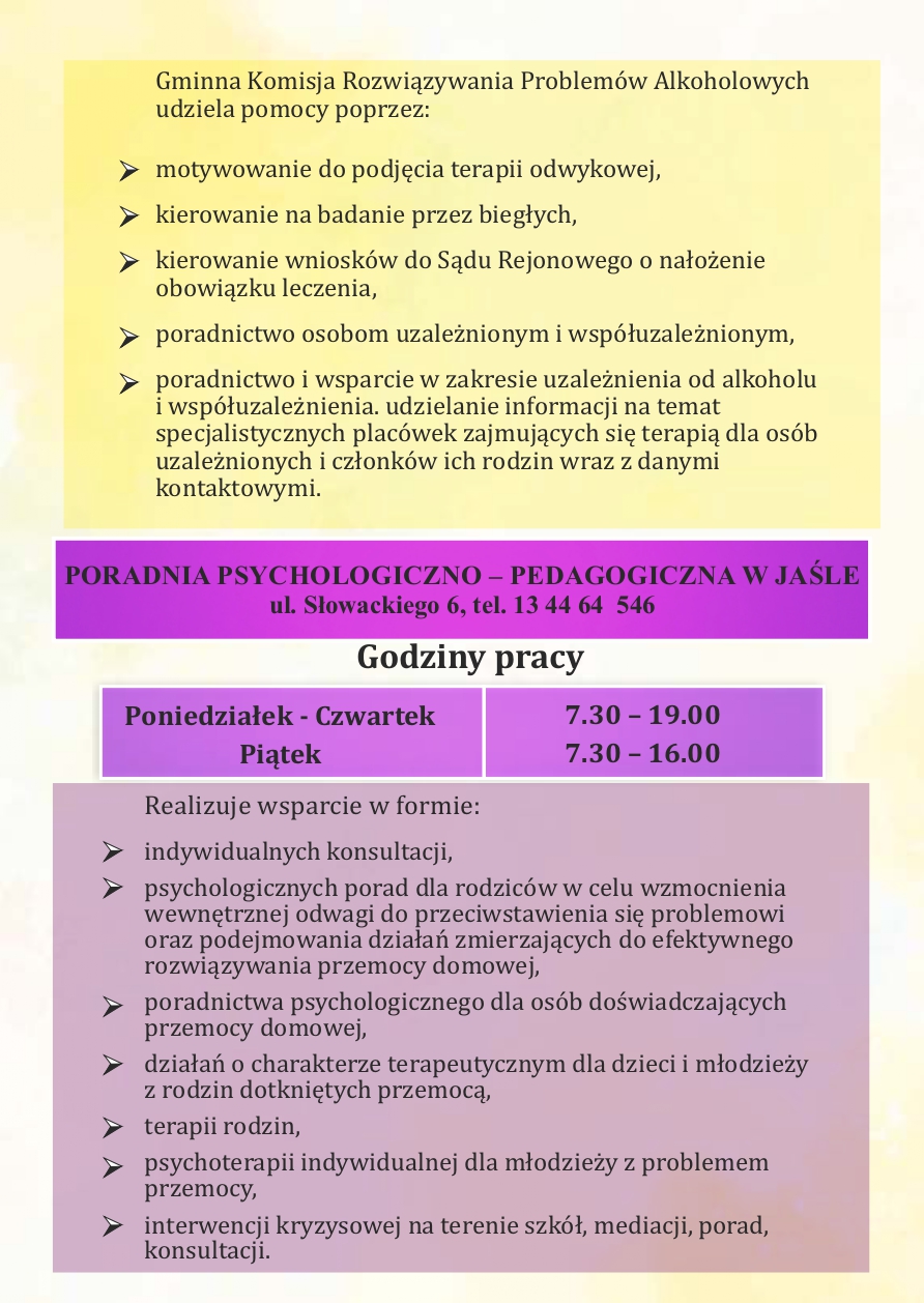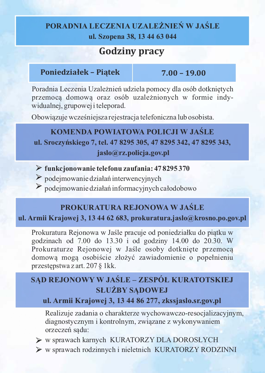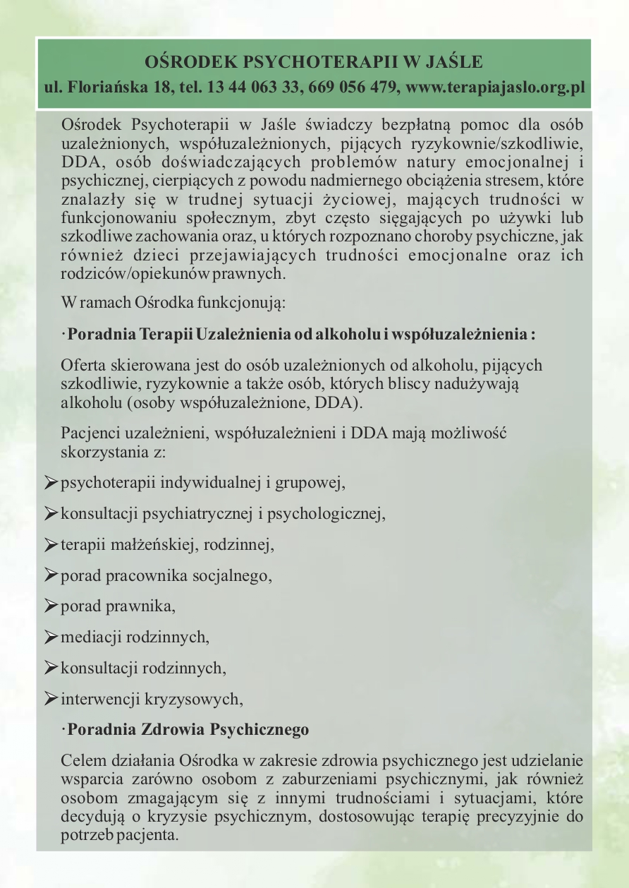 Informator dla mieszkańców Gminy Jasło o formach pomocy dla osób dotkniętych bądź zagrożonych przemocą domową, osób dotkniętych bądź zagrożonych uzależnieniem od alkoholu lub narkotyków oraz rodzin w kryzysie