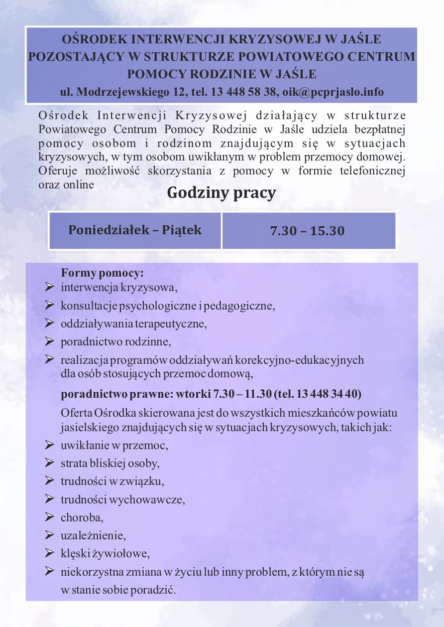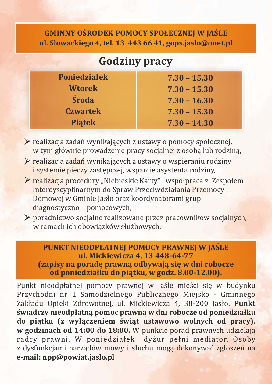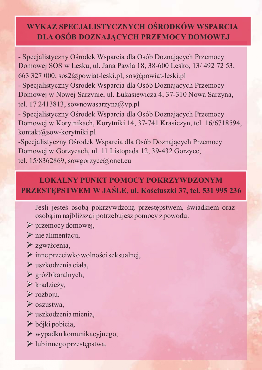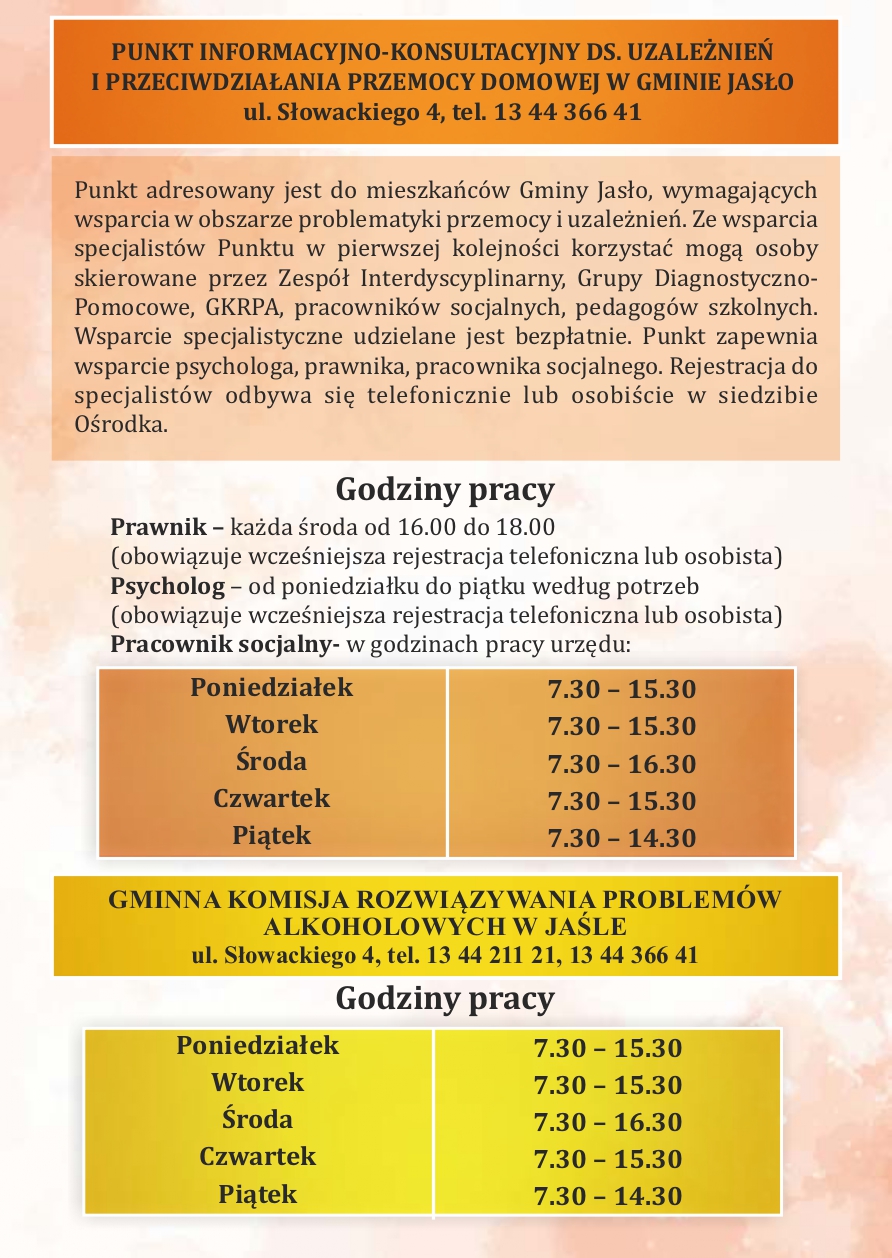 Informator dla mieszkańców Gminy Jasło o formach pomocy dla osób dotkniętych bądź zagrożonych przemocą domową, osób dotkniętych bądź zagrożonych uzależnieniem od alkoholu lub narkotyków oraz rodzin w kryzysie