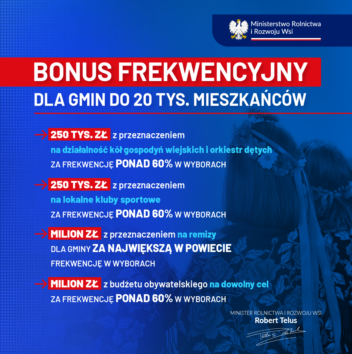 Ponadto, gminy, które osiągną frekwencję powyżej 60%, mogą liczyć na dodatkowe wsparcie finansowe. W takim przypadku każda jednostka samorządowa otrzyma:
