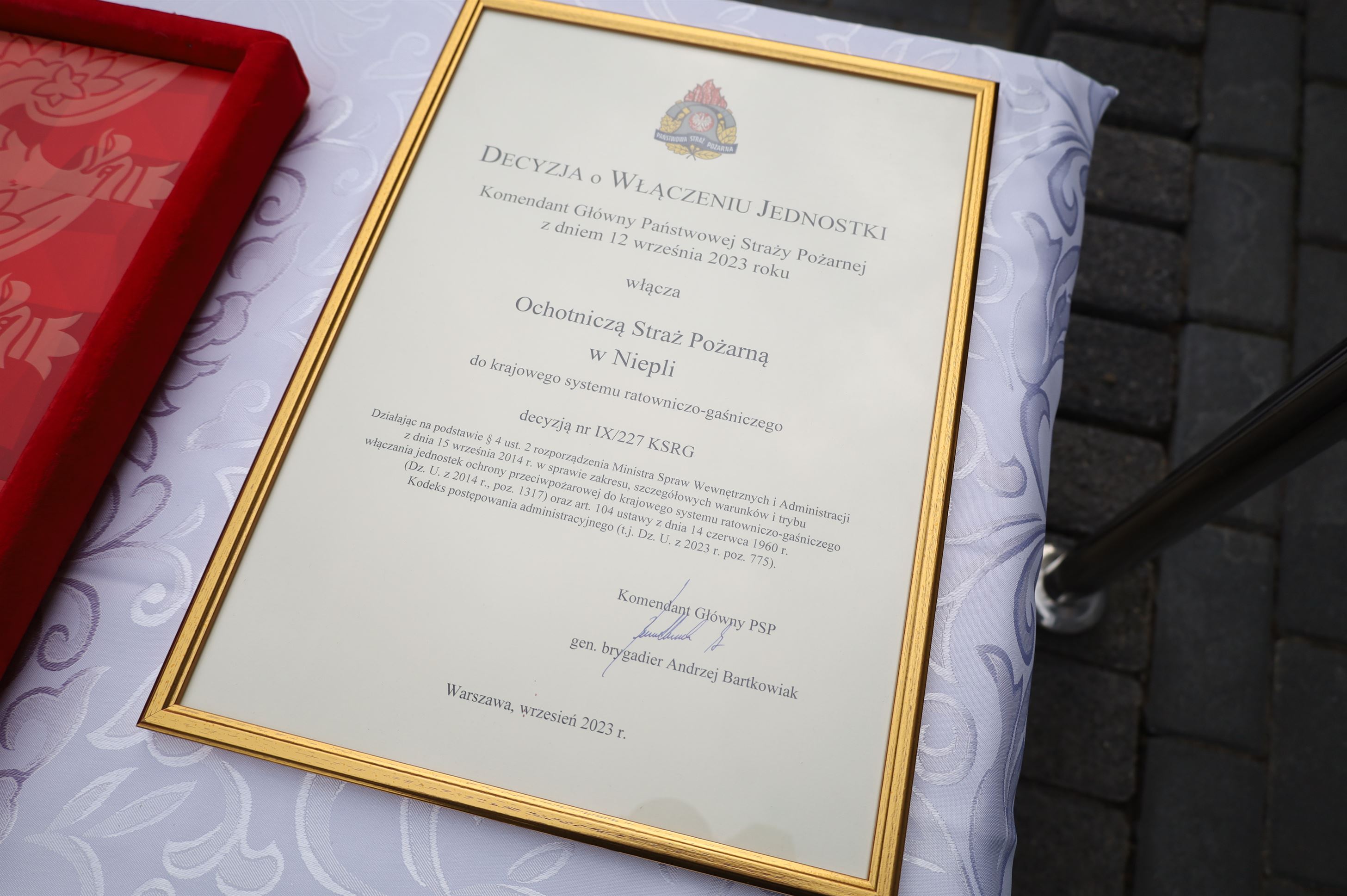 St. bryg. Andrzej Marczenia – Zastępca Komendanta Wojewódzkiego PSP w Rzeszowie na ręce bryg. Piotra Śmietany – Komendanta Powiatowego PSP w Jaśle, Wojciecha Piękosia – Wójta Gminy Jasło oraz druha Rafała Dziedzica – Prezesa OSP Niepla przekazał decyzję o włączeniu jednostki do krajowego systemu.