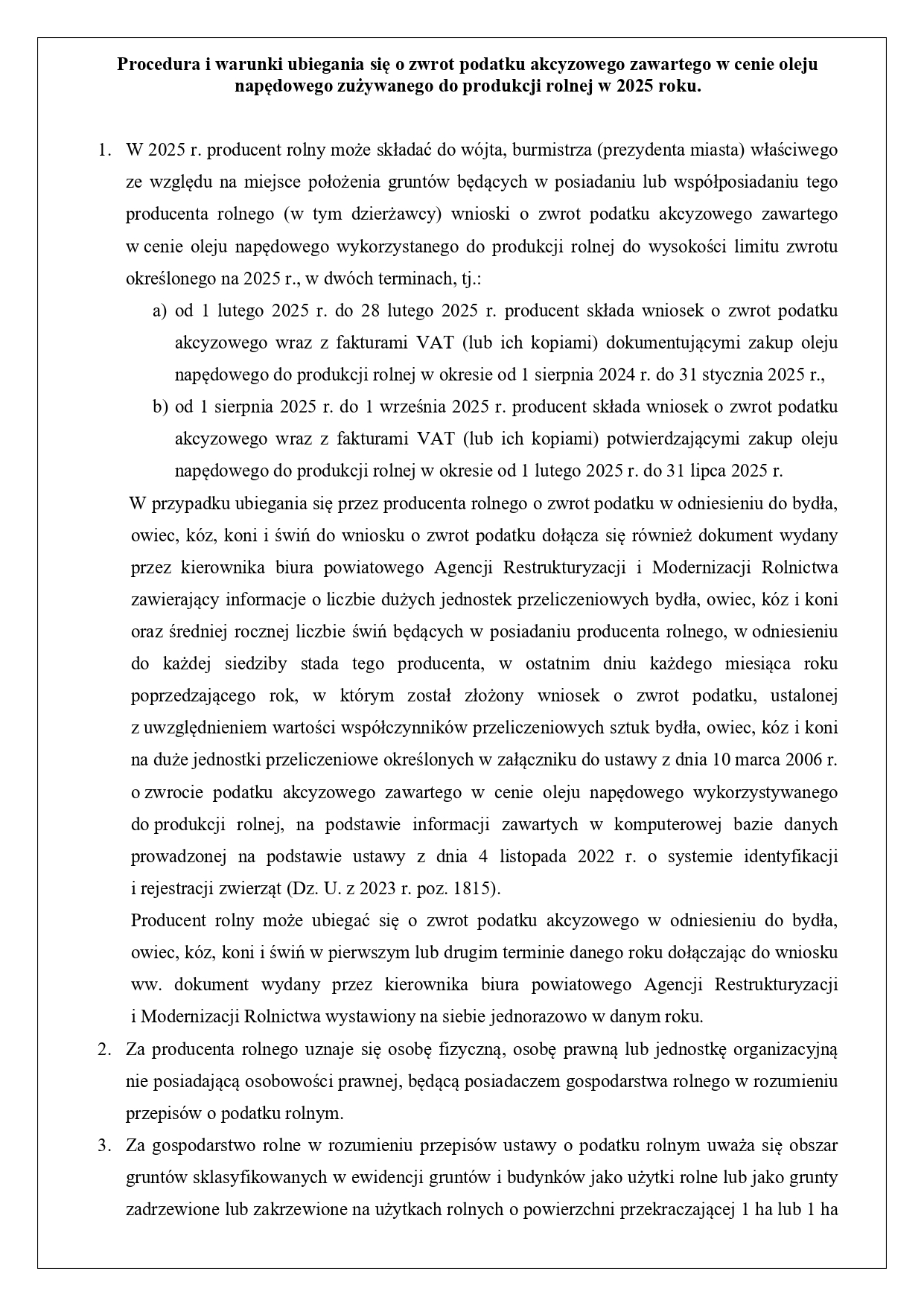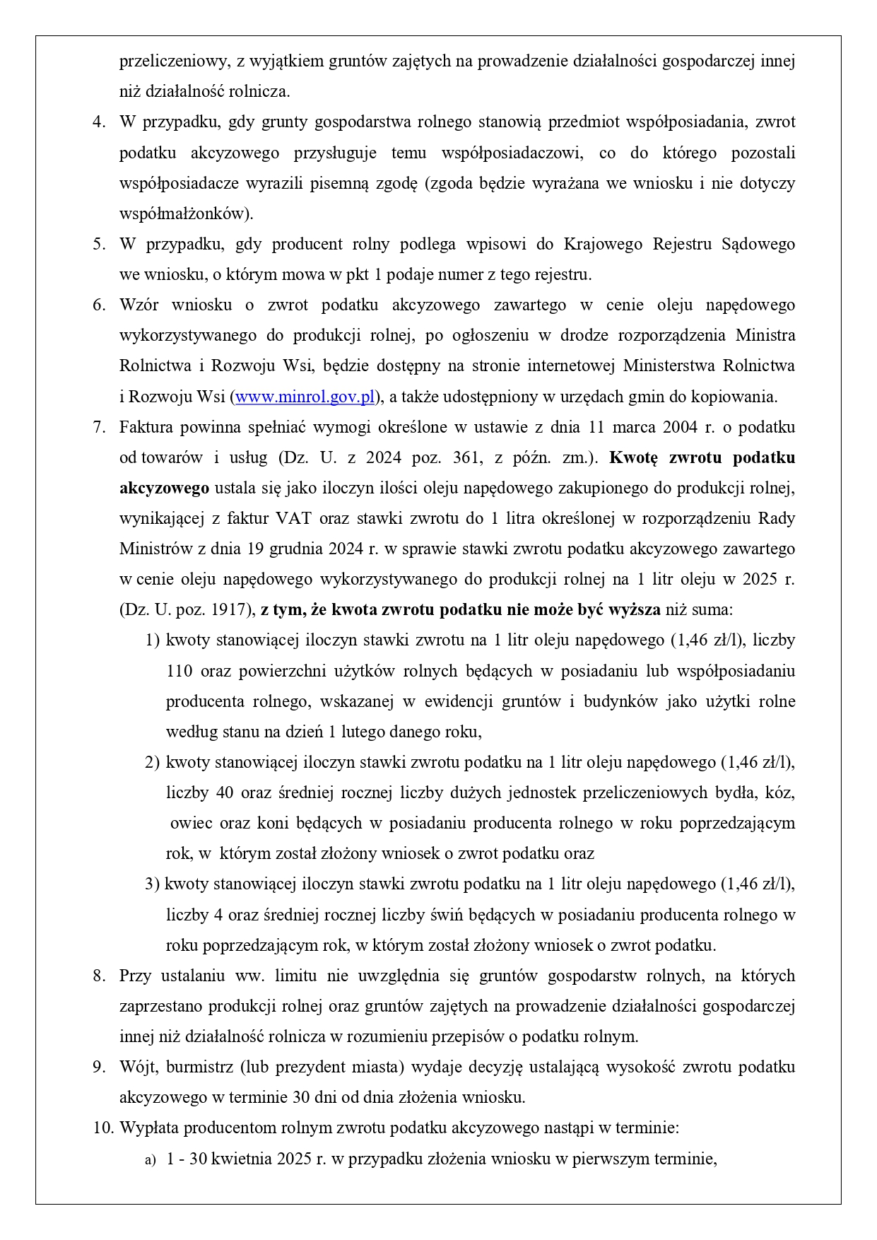Minister Rolnictwa i Rozwoju Wsi informuje o warunkach zwrotu podatku akcyzowego