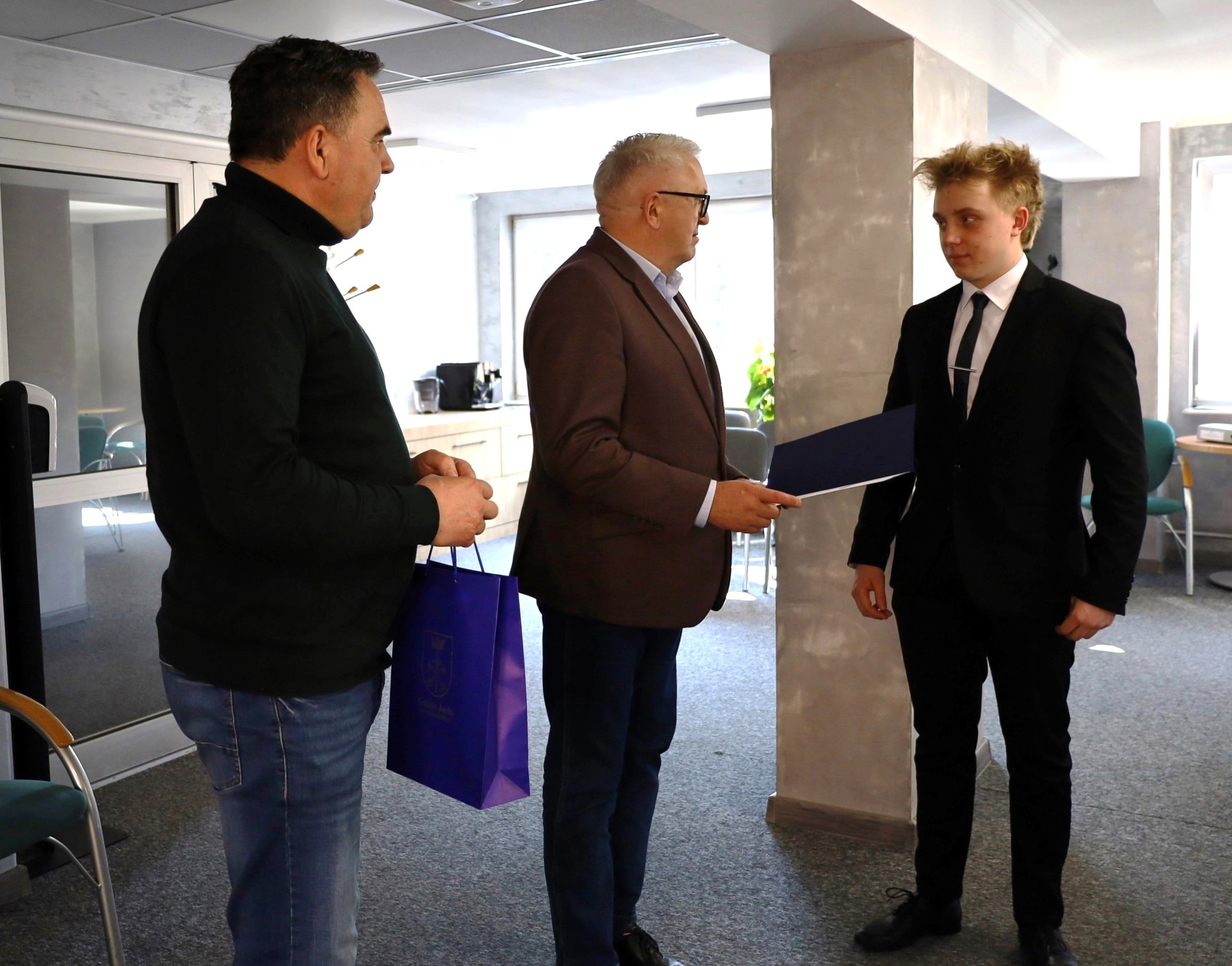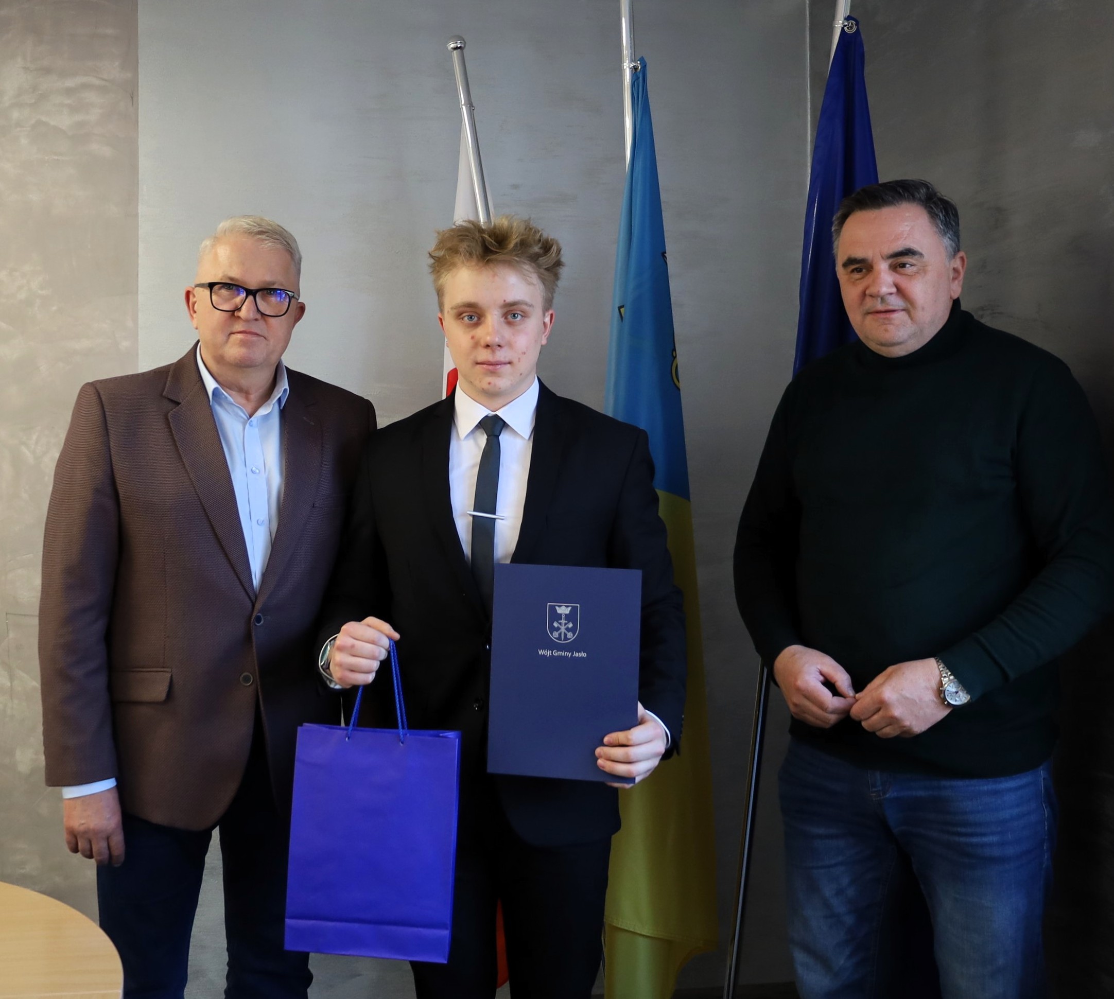Wójt Gminy Jasło Wojciech Piękoś wręczył nagrodę za wysokie osiągnięcia sportowe w 2024 roku Mikołajowi Kurowskiemu z Żółkowa.