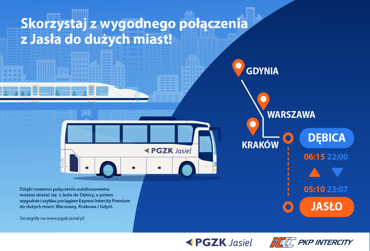 Dzięki nowemu połączeniu dostaniemy się z Jasła do Dębicy, a potem wygodnie i szybko pociągiem do dużych miast: Warszawy, Krakowa i Gdyni.