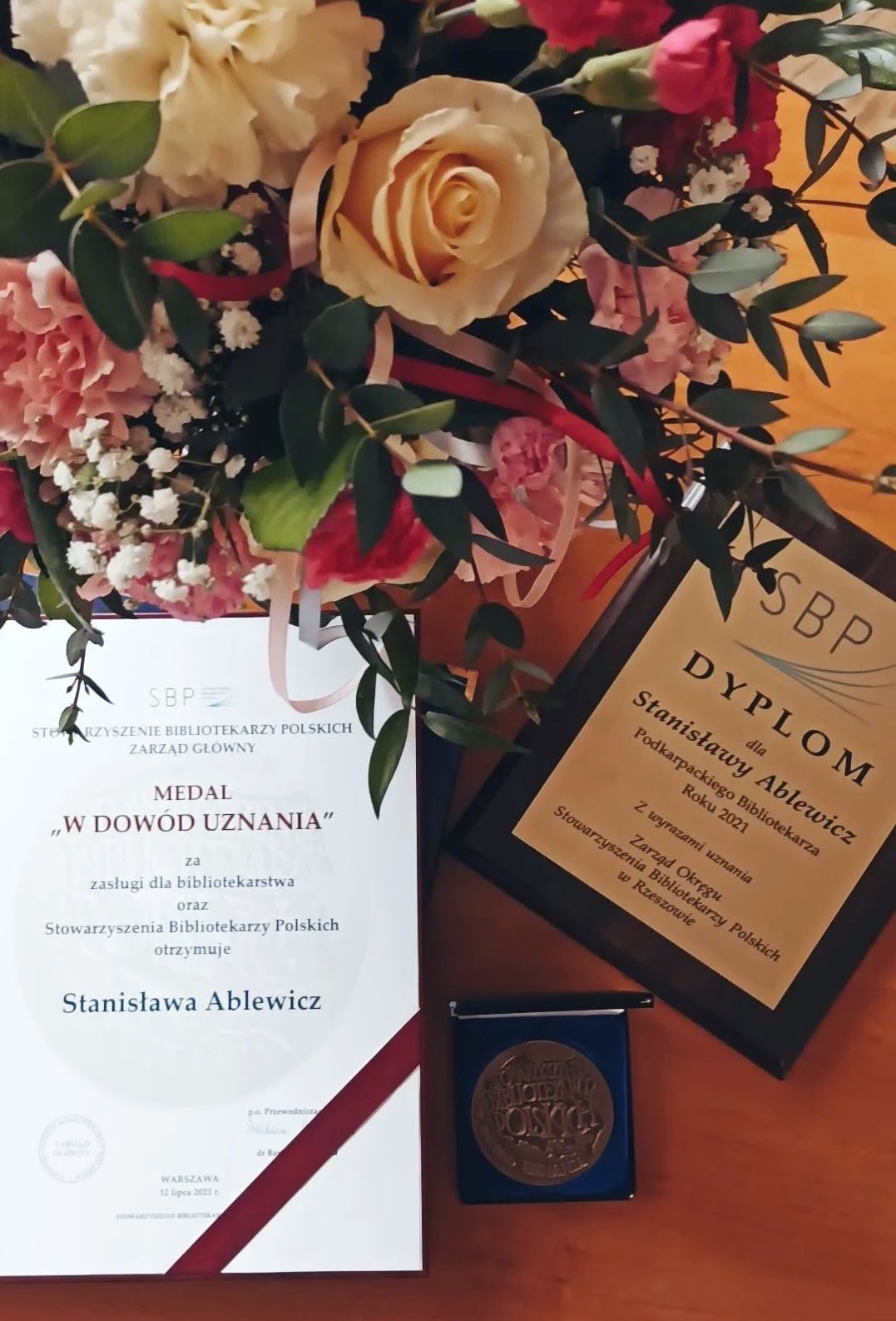 Dyplom „Podkarpackiego Bibliotekarza Roku” oraz medal „W Dowód Uznania” wręczyli Bożena Janda Dyrektor Wojewódzkiej i Miejskiej Biblioteki Publicznej w Rzeszowie oraz Andrzej Dominik Jagodziński Dyrektor Miejskiej i Powiatowej Biblioteki Publicznej w Kolbuszowej.