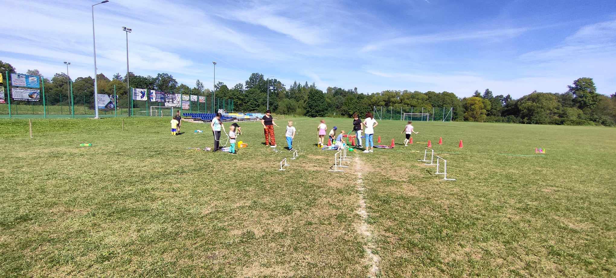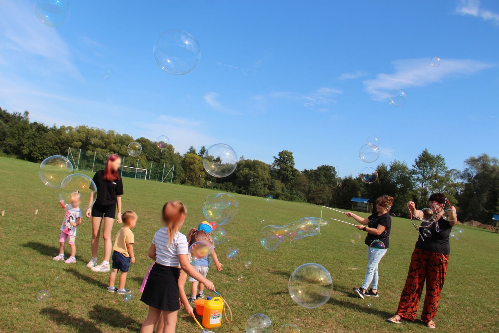 - Gry i zabawy na świeżym powietrzu - dzieci pod opieką pań świetlicowych oraz pracowników socjalnych miały do dyspozycji dmuchaną zjeżdżalnię, robiły kolorowe bańki mydlane, bawiły się chustą Klanza, chodziły na szczudłach, pokonywały tory przeszkód.