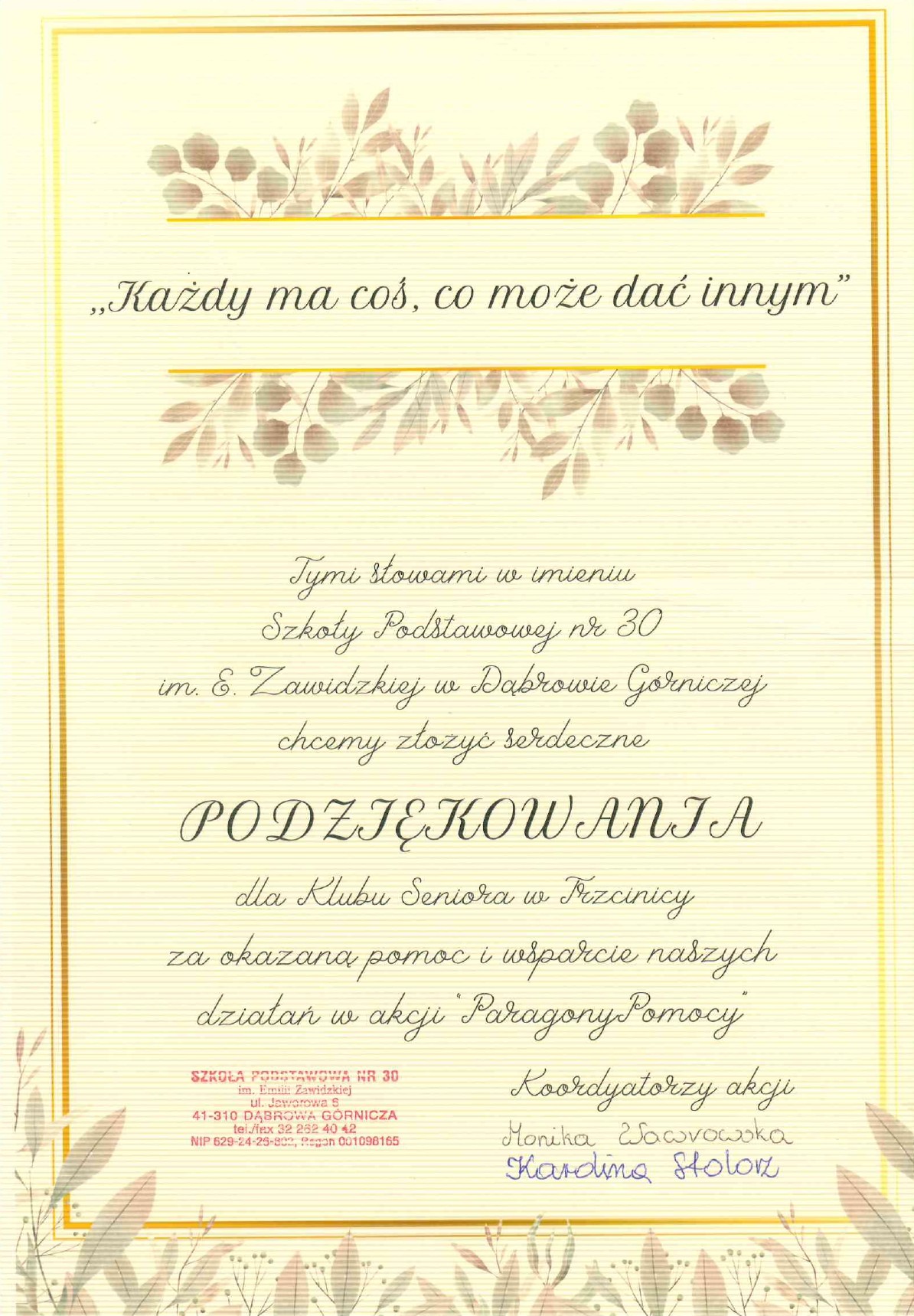 Klub Seniora w Trzcinicy otrzymał Podziękowanie od Szkoły Podstawowej nr 30 w Dąbrowie Górniczej za udział w akcji "Paragony Pomocy".