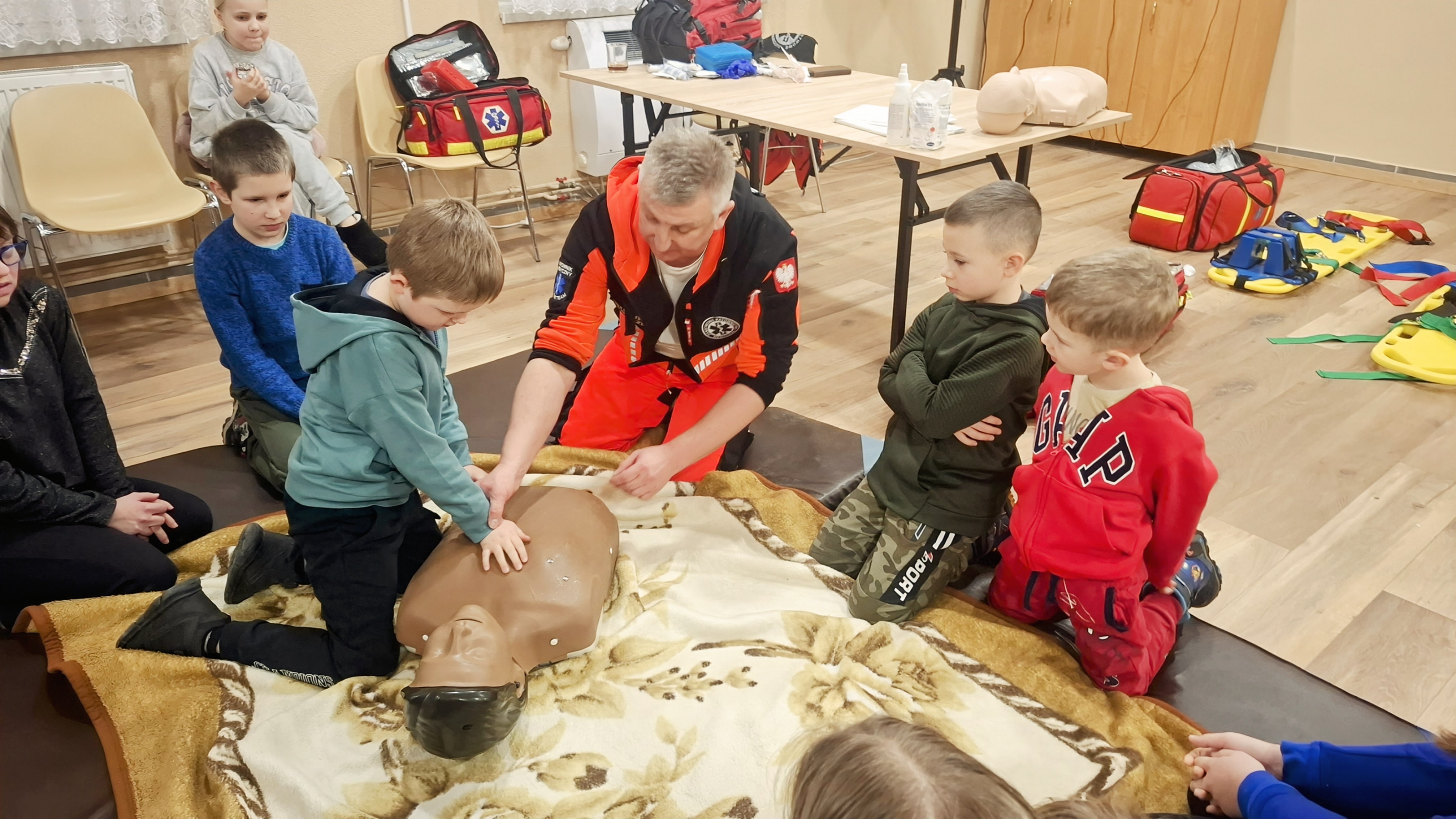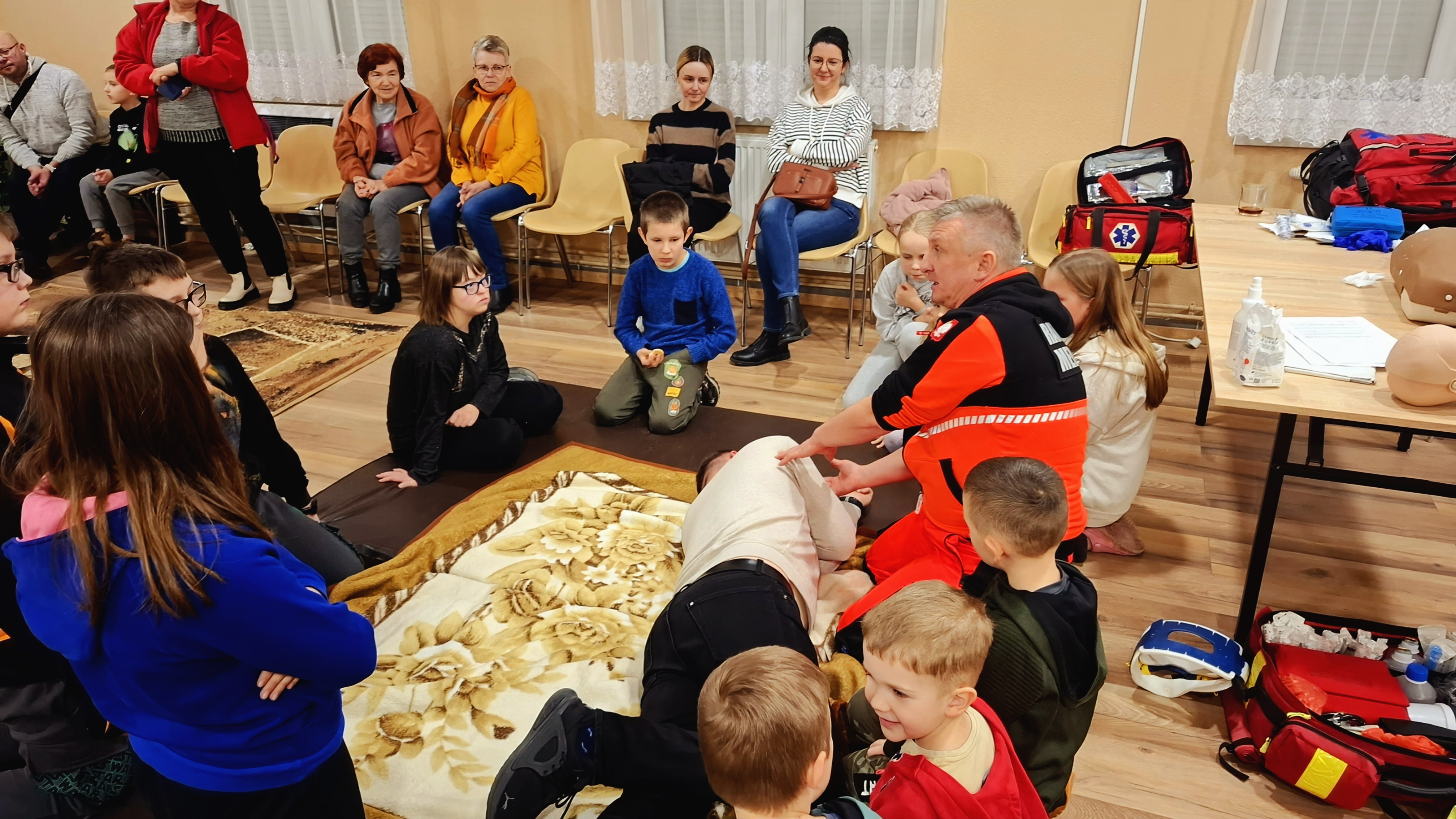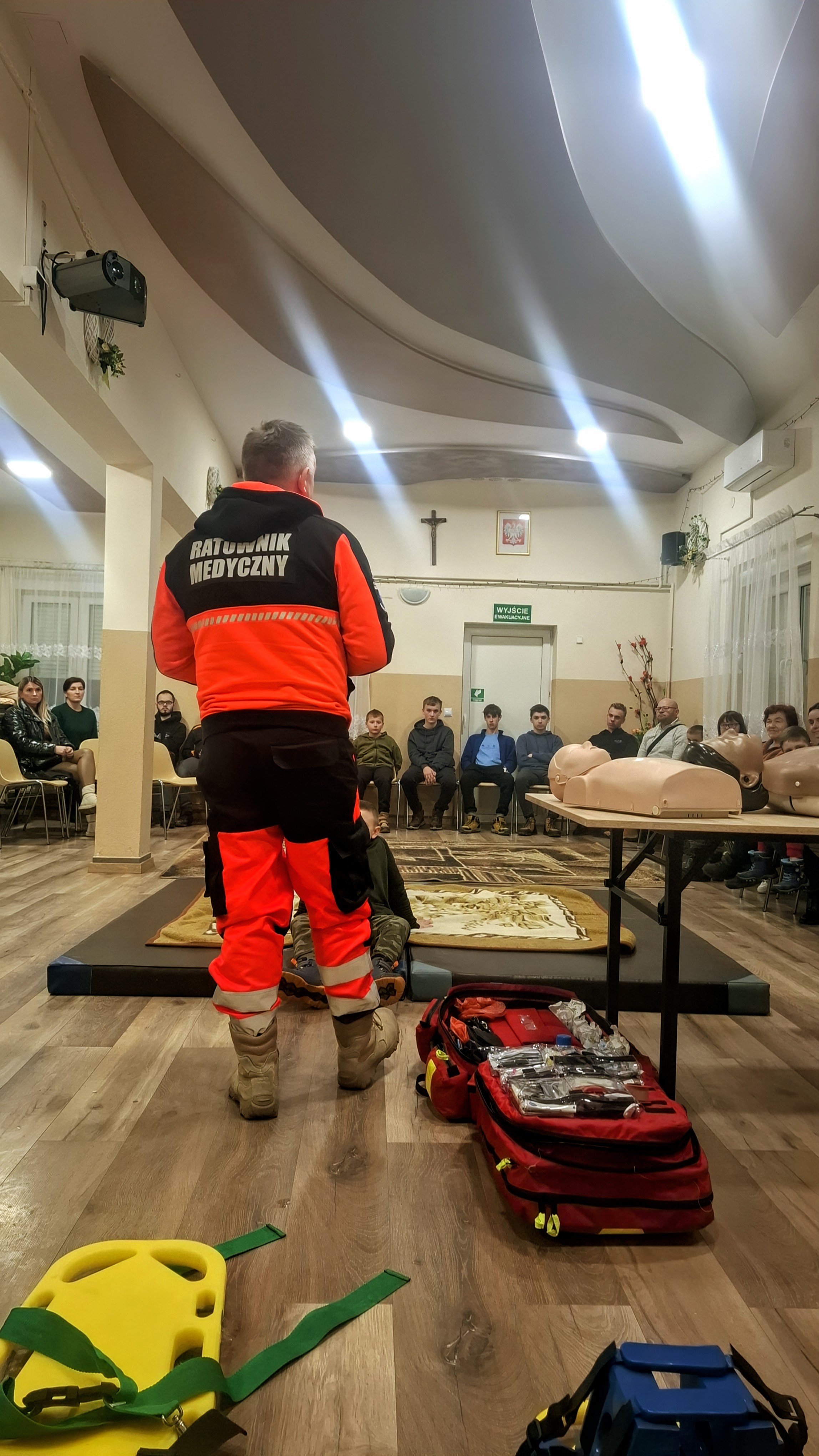 Pokaz poprowadził doświadczony ratownik medyczny Pan Mariusz , który w przystępny sposób przekazał uczestnikom niezbędną wiedzę z zakresu pierwszej pomocy. Podczas zajęć omówiono wszystkie kluczowe aspekty udzielania pomocy w nagłych przypadkach, takie jak: