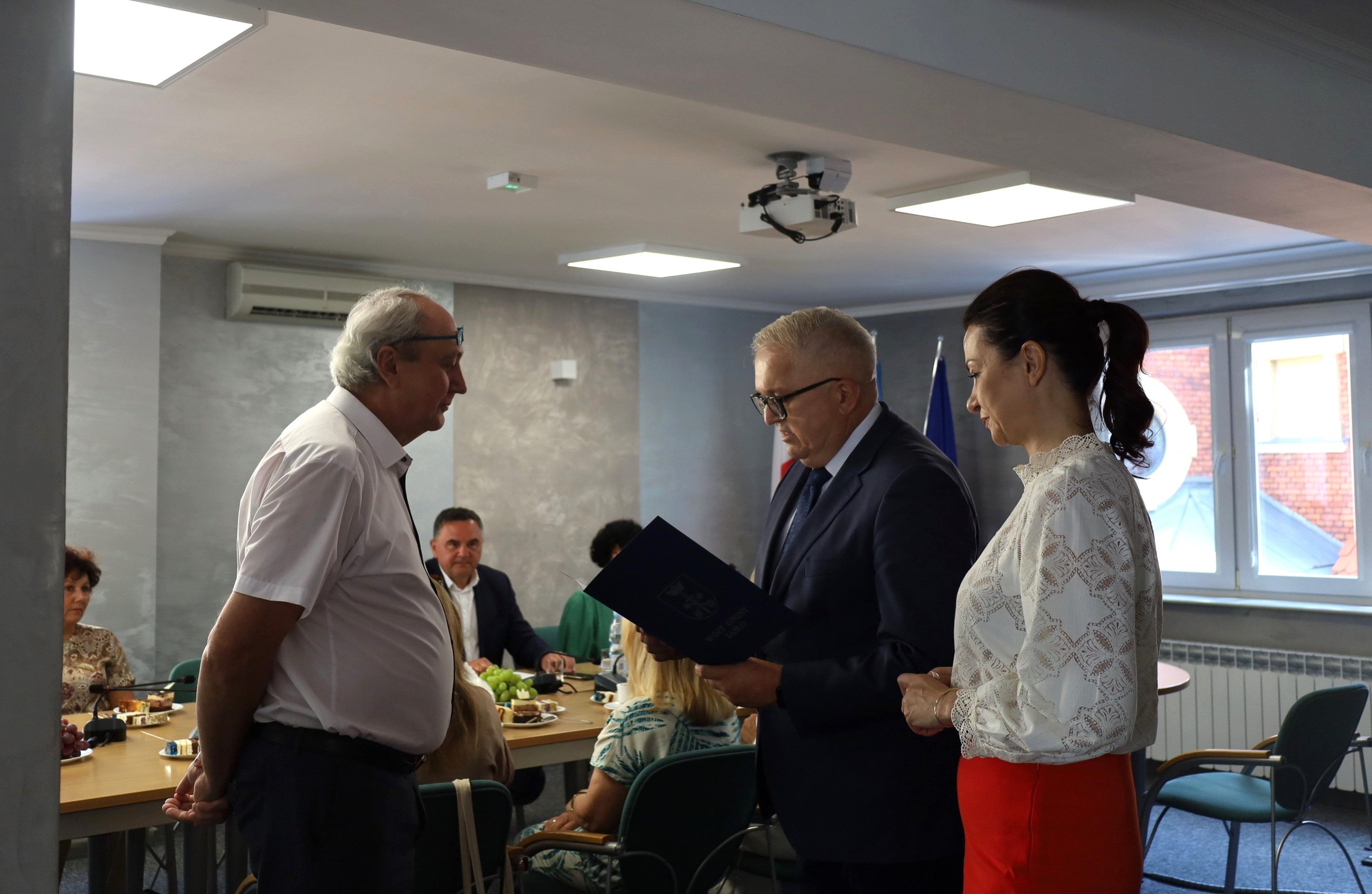 Oficjalne pożegnanie dyrektorów szkół podstawowych z terenu Gminy Jasło odchodzących na emeryturę: Pani Ewy Marchewki - dyrektora Szkoły Podstawowej im. Macieja Rataja w Opaciu oraz Pana Antoniego Wydro - dyrektora Szkoły Podstawowej Nr 1 im. św. Jana Kantego w Osobnicy odbyło się w Urzędzie Gminy Jasło w dniu 29 sierpnia 2024 r.