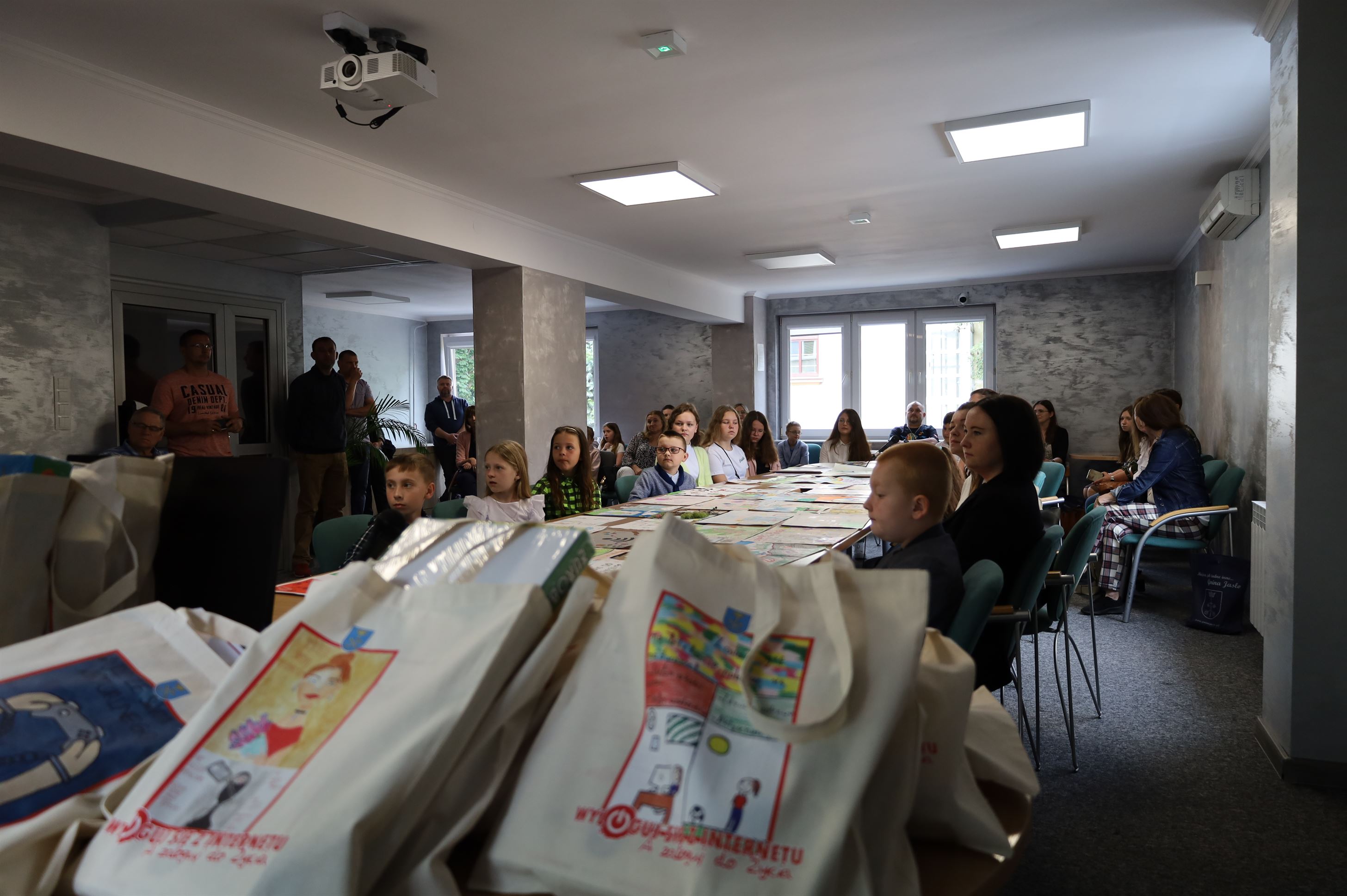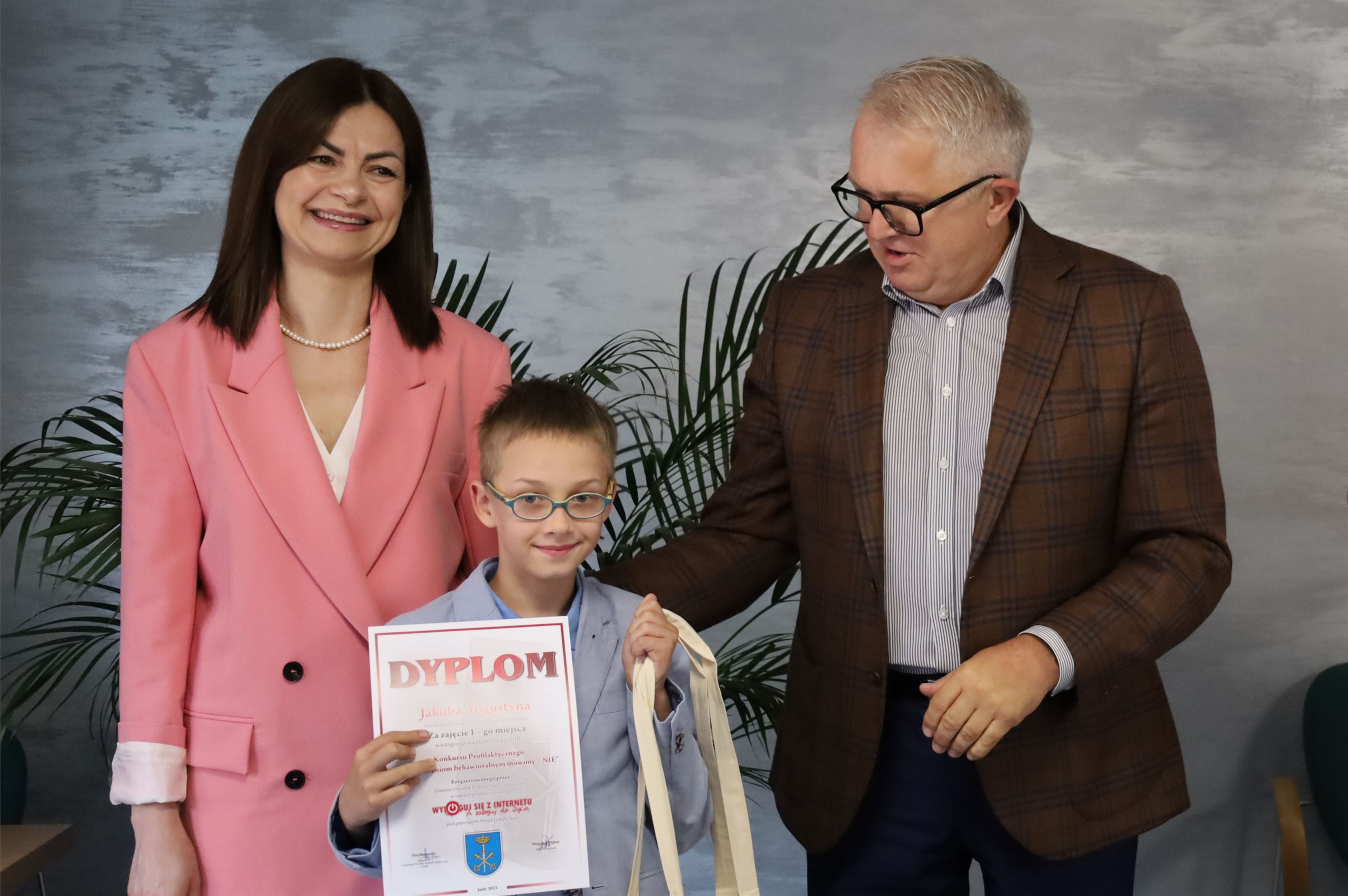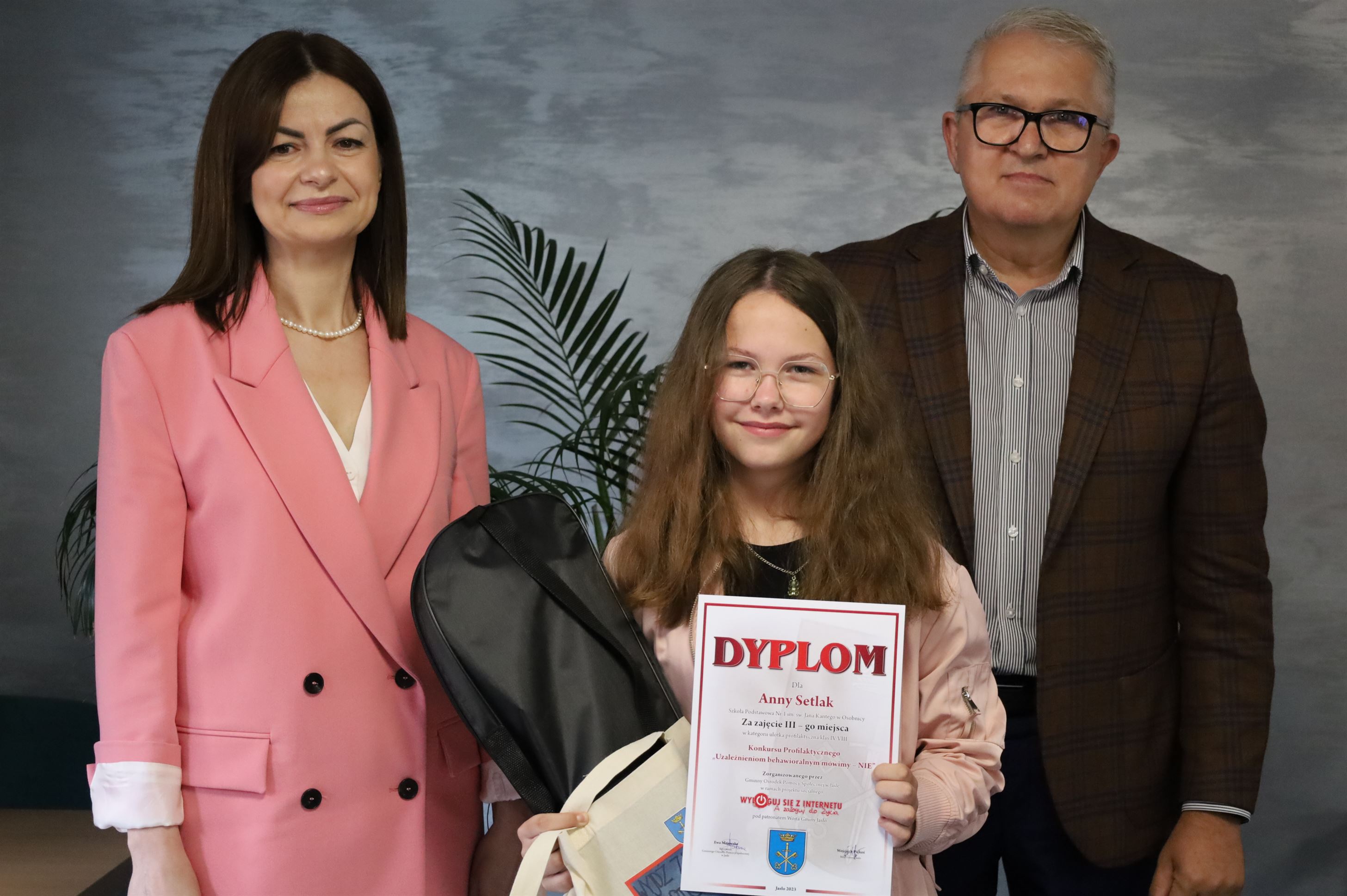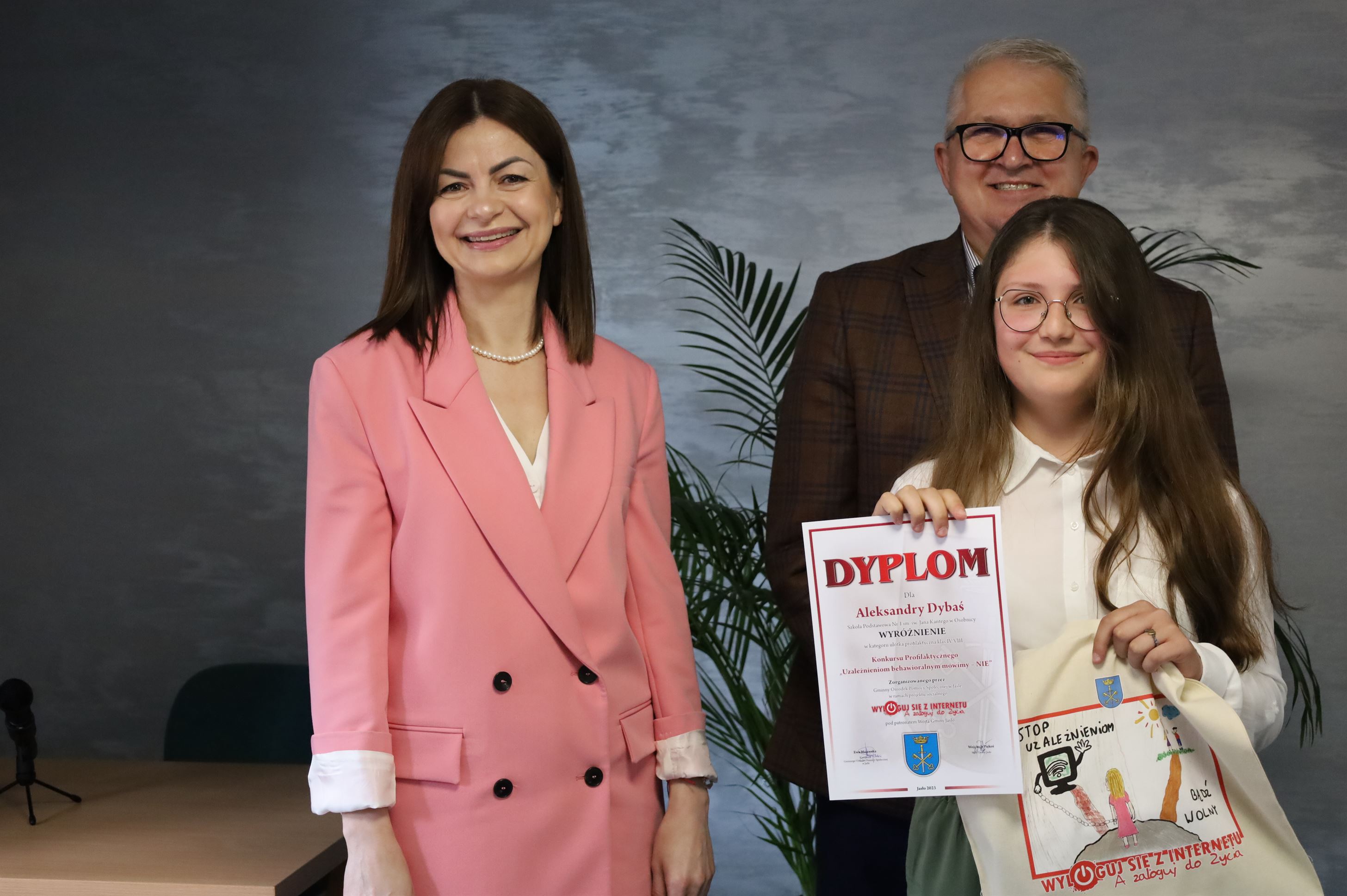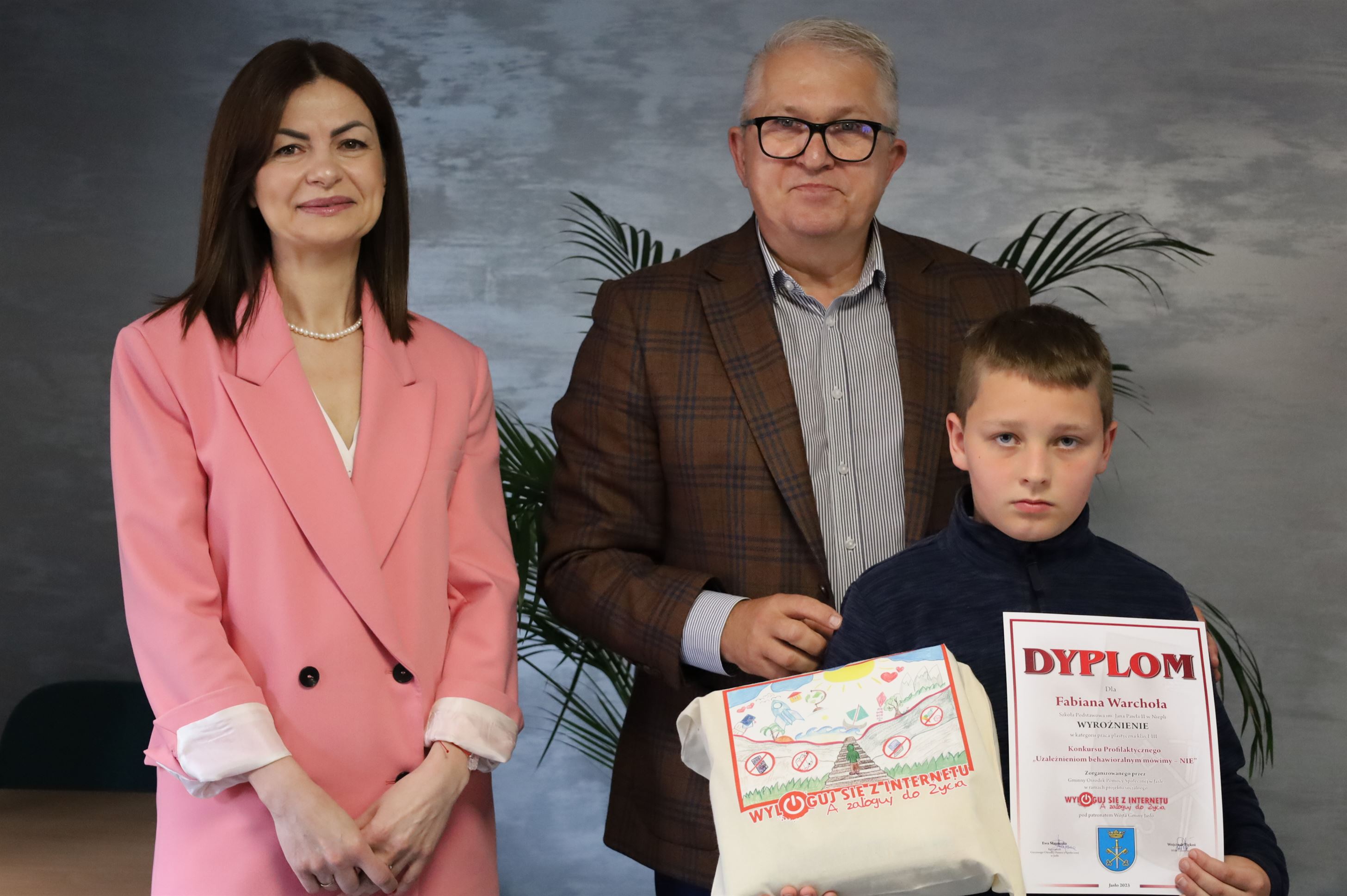 W świetlicy Urzędu Gminy w Jaśle odbyło się rozdanie nagród dla uczniów szkół podstawowych z Gminy Jasło biorących udział w konkursie profilaktycznym „Uzależnieniom behawioralnym mówimy – NIE” w ramach projektu socjalnego „Wyloguj się z Internetu a zaloguj do ŻYCIA”. Uczniowie mieli do przygotowania prace w dwóch kategoriach wiekowych: klasy od I-III praca plastyczna, a klasy IV-VIII ulotka profilaktyczna. Łącznie do organizatora konkursu wpłynęło 61 prac w tym 21 prac ulotki profilaktycznej oraz 40 prac plastycznych. Spośród wszystkich uczniów biorących udział w konkursie 12 zostało nagrodzonych, a 11 otrzymało wyróżnienia. Laureaci otrzymali dyplomy oraz wiele atrakcyjnych nagród, które pomogą im spędzać czas aktywnie m.in. notesy, długopisy i smycze z logiem projektu, gry edukacyjne, torby EKO z logiem własnej pracy, bidony na wodę oraz piłkę nożną i sprzęt do badmintona. Uczniowie biorący udział w konkursie otrzymali również drobne upominki oraz dyplomy. Nagrodzona ulotka profilaktyczna została wydrukowana i rozpowszechniona wśród uczniów szkół podstawowych z terenu Gminy Jasło.