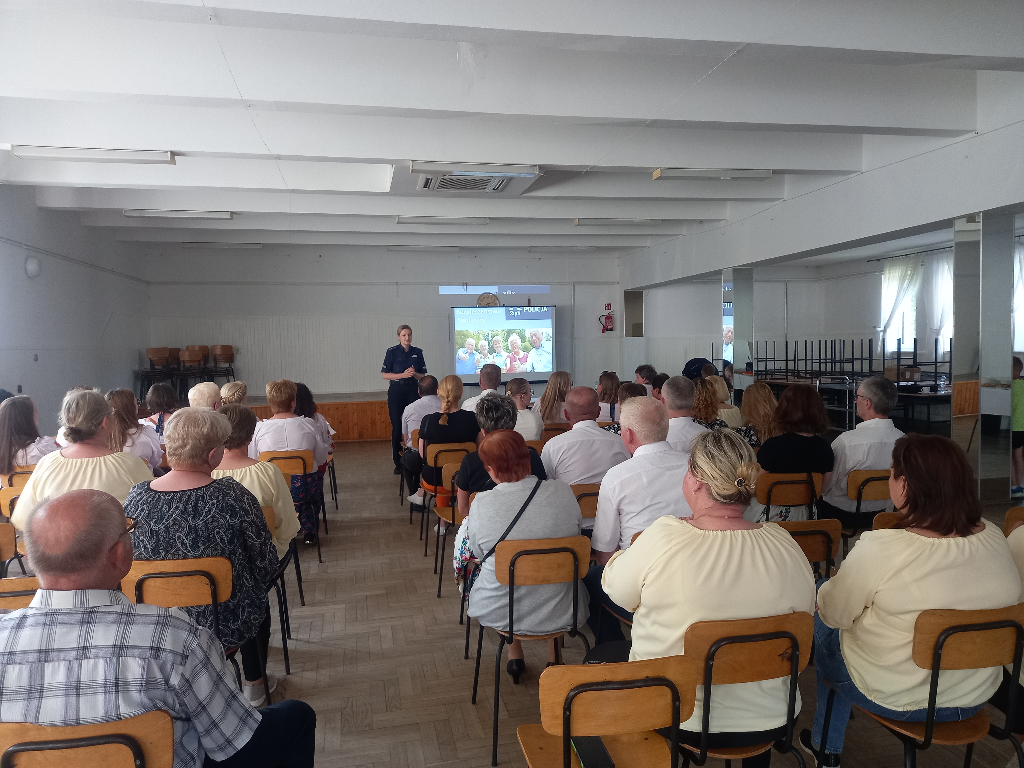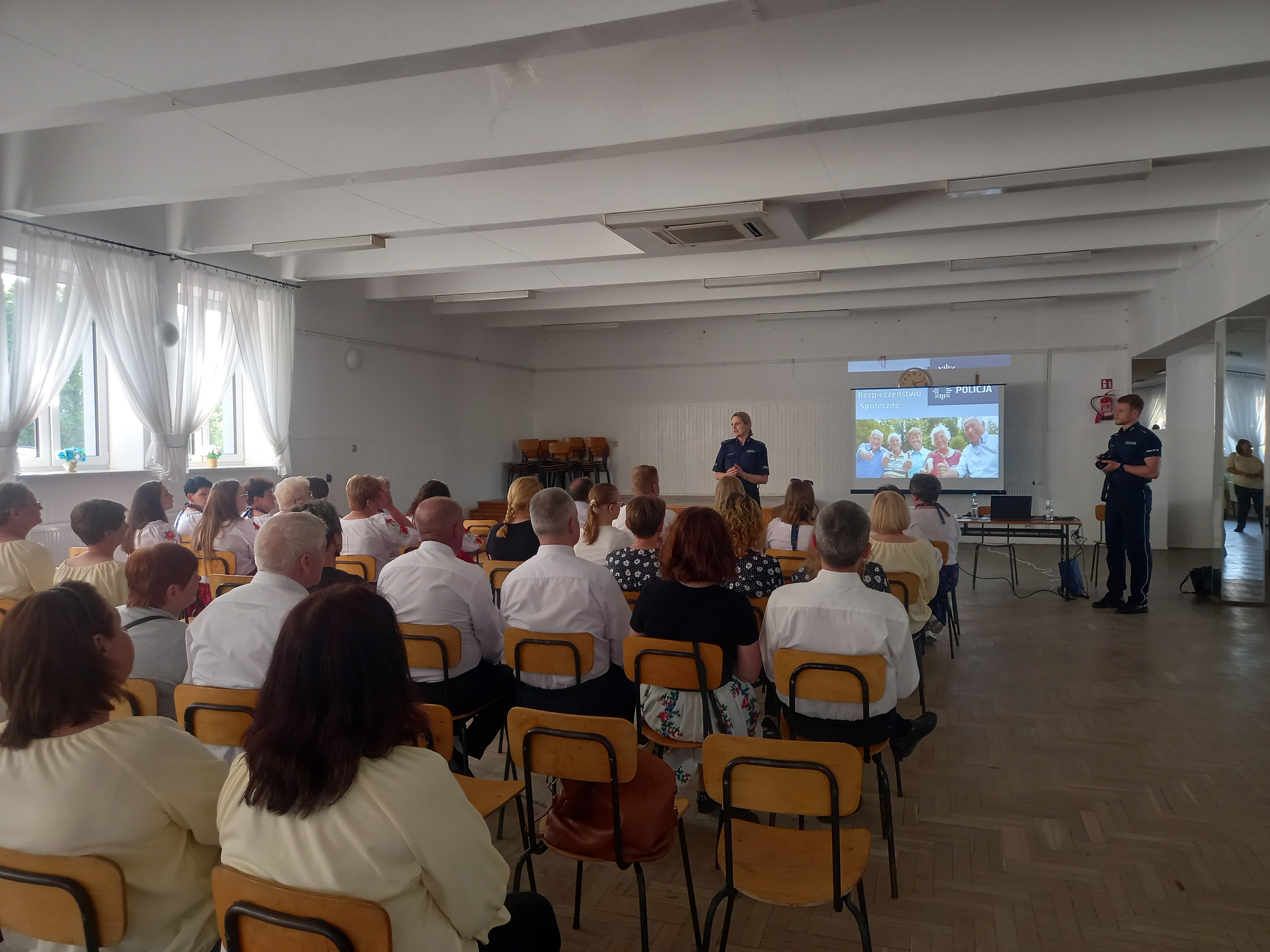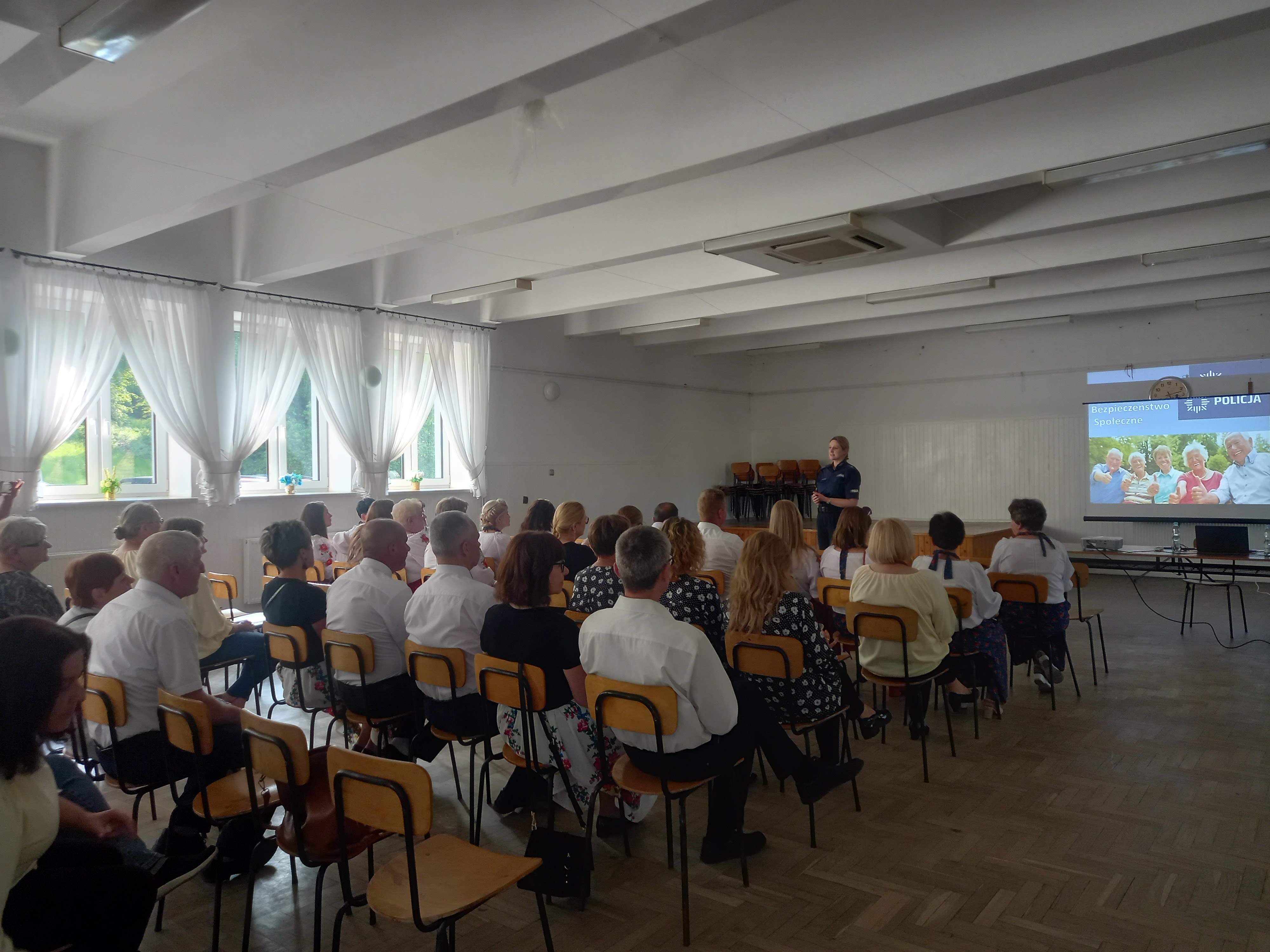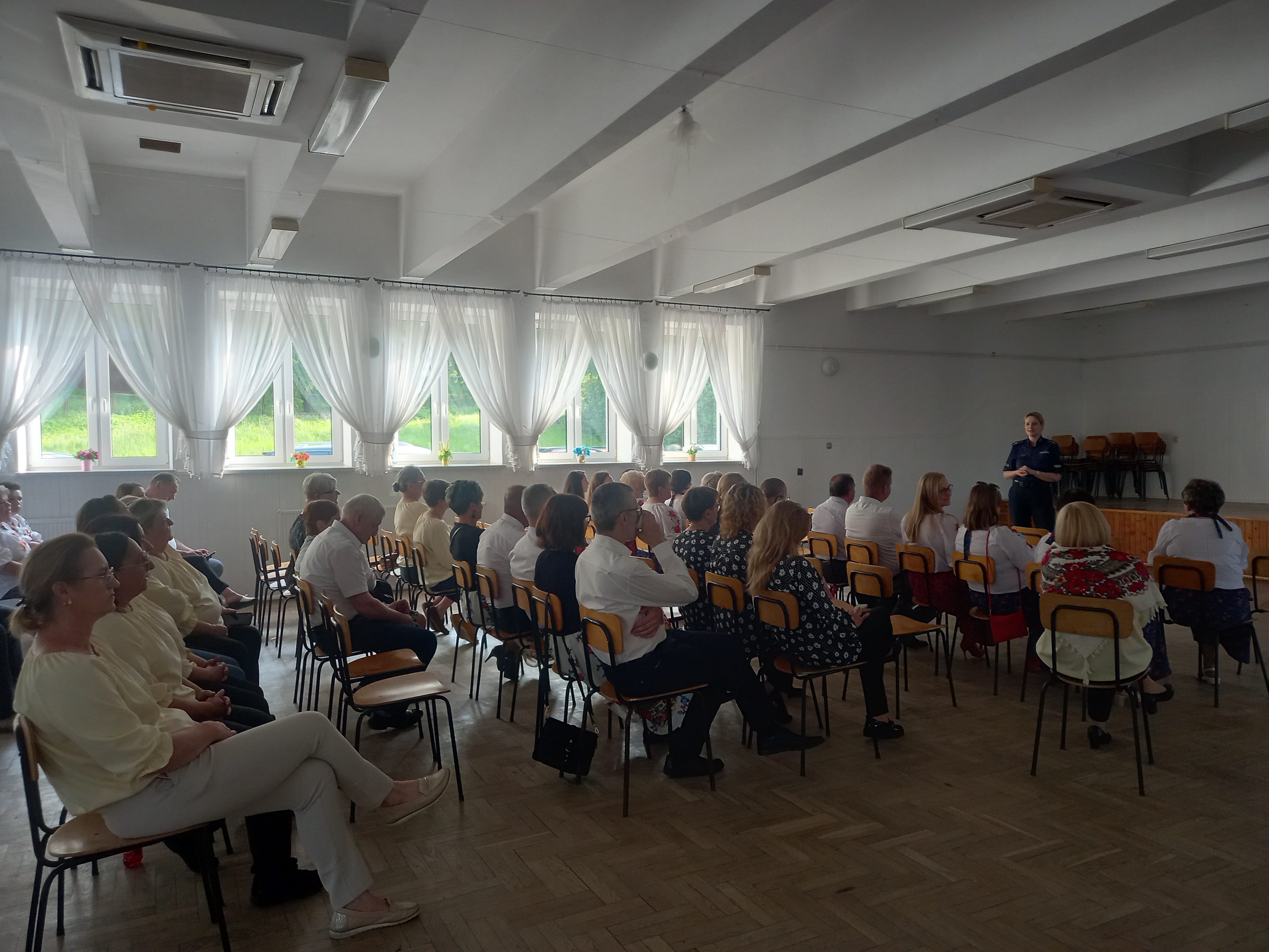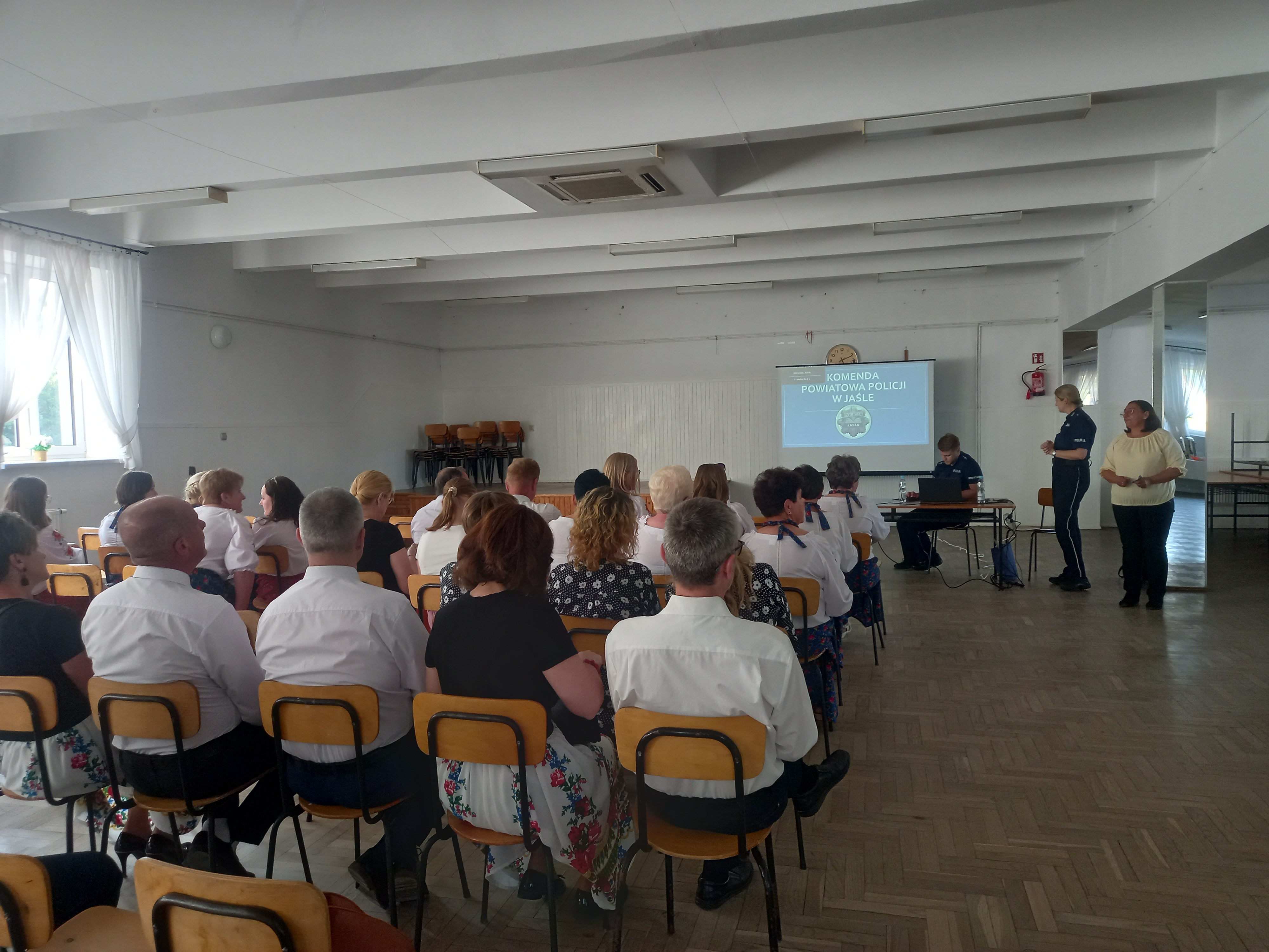 Przedstawiciele Komendy Powiatowej Policji w Jaśle: mł. asp. Daniel Lelko – Oficer Prasowy oraz mł. asp. Barbara Pawłowska – Specjalista w Zespole ds. Profilaktyki Społecznej, Nieletnich i Patologii przedstawili aktualne zagrożenia oraz metody działania w przypadku spotkania się z przypadkami przemocy domowej, przestępstw na szkodę małoletnich, cyberprzestępczości, oszustw i lichwy, a także nakreślili najnowsze przepisy i zasady bezpieczeństwa w ruchu drogowym.