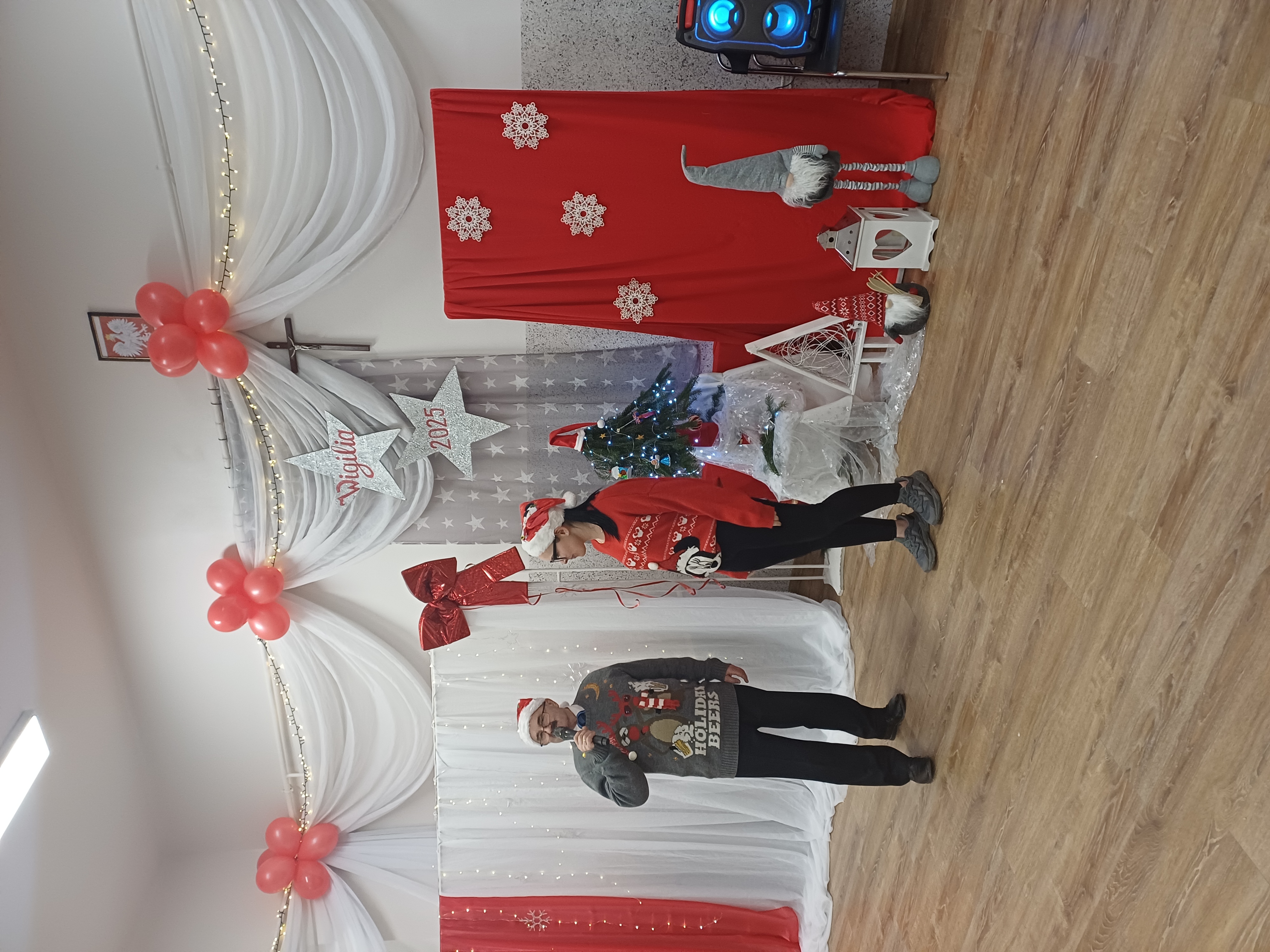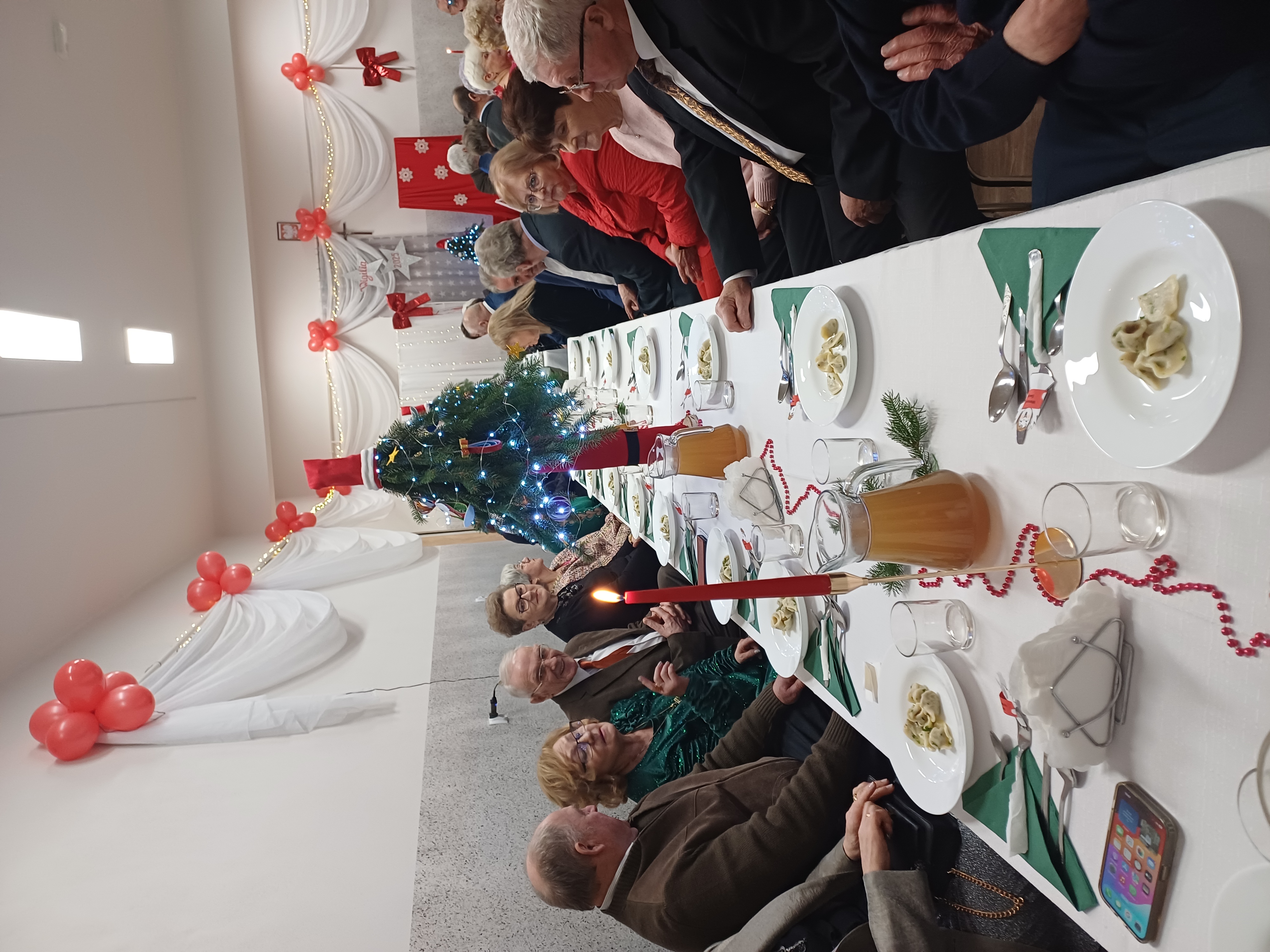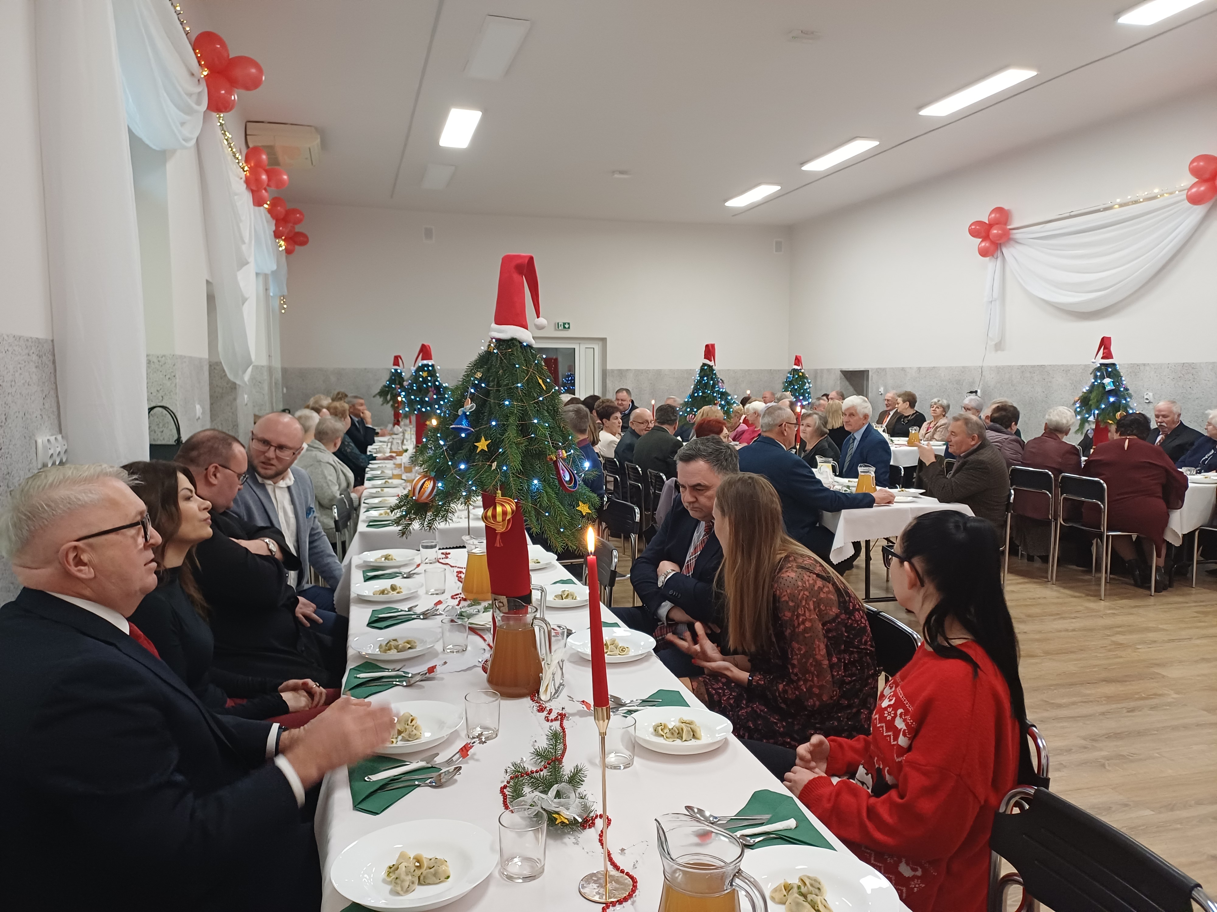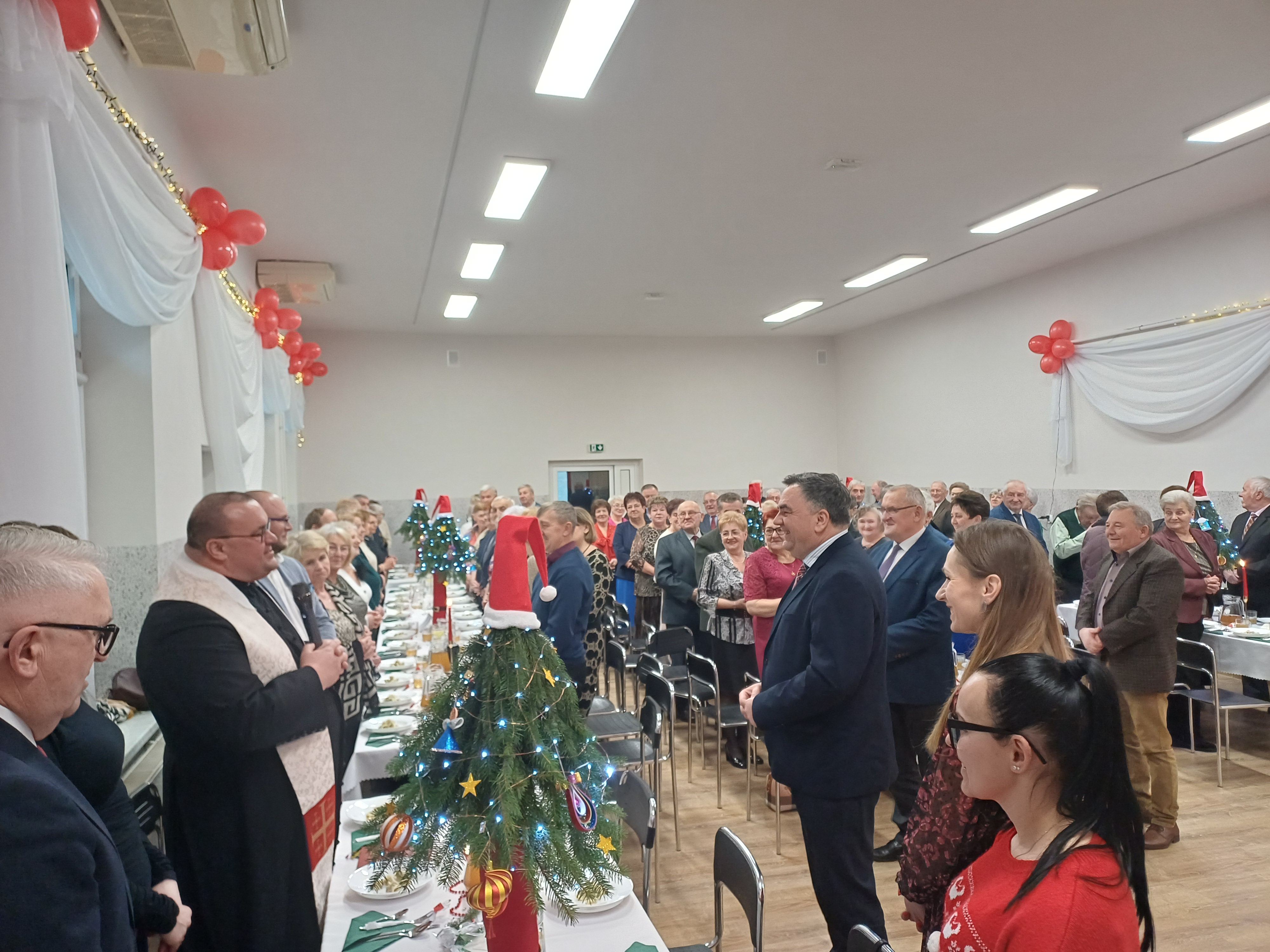 Spotkanie rozpoczęło się tradycyjną modlitwą, którą odmówił ks. Proboszcz, następnie uczestnicy łamali się opłatkiem, składając sobie świąteczne życzenia. Po spożyciu tradycyjnych potraw wigilijnych, uczestników odwiedzili wysłańcy Świętego Mikołaja, którzy obdarowali zarówno gości, jak i wszystkich obecnych podarunkami. W dalszej części spotkania, pod przewodnictwem Pana Wójta, cała sala wspólnie śpiewała kolędy, które były dobrze znane wszystkim uczestnikom.
