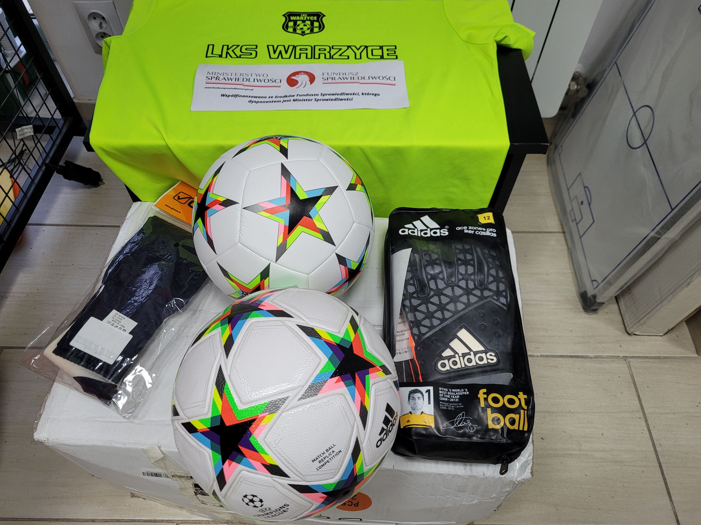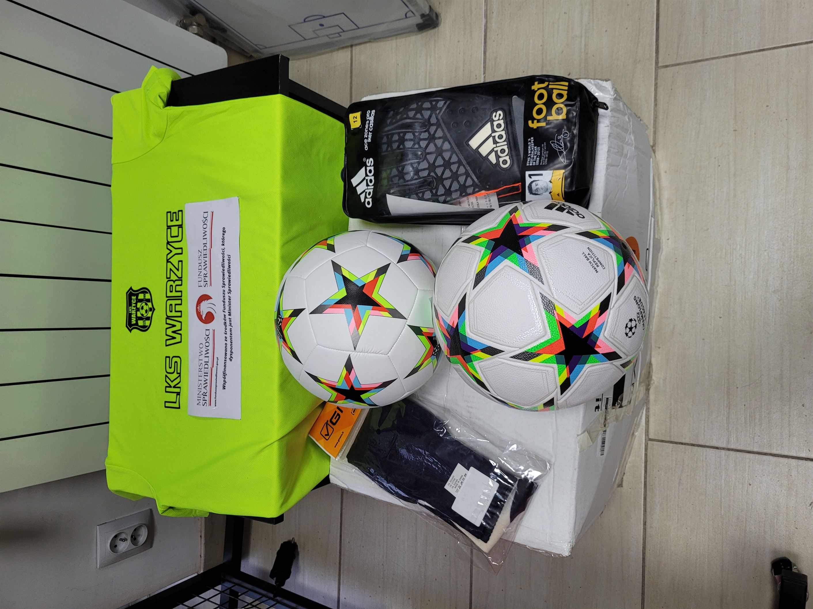 LKS Warzyce wzbogacił się o piłki nożne (meczowe) – 4 szt.; piłki nożne (treningowe) – 5 szt.; stroje sportowe (koszulki, spodenki, getry) – 24 kpl.; rękawice bramkarskie – 2 szt.