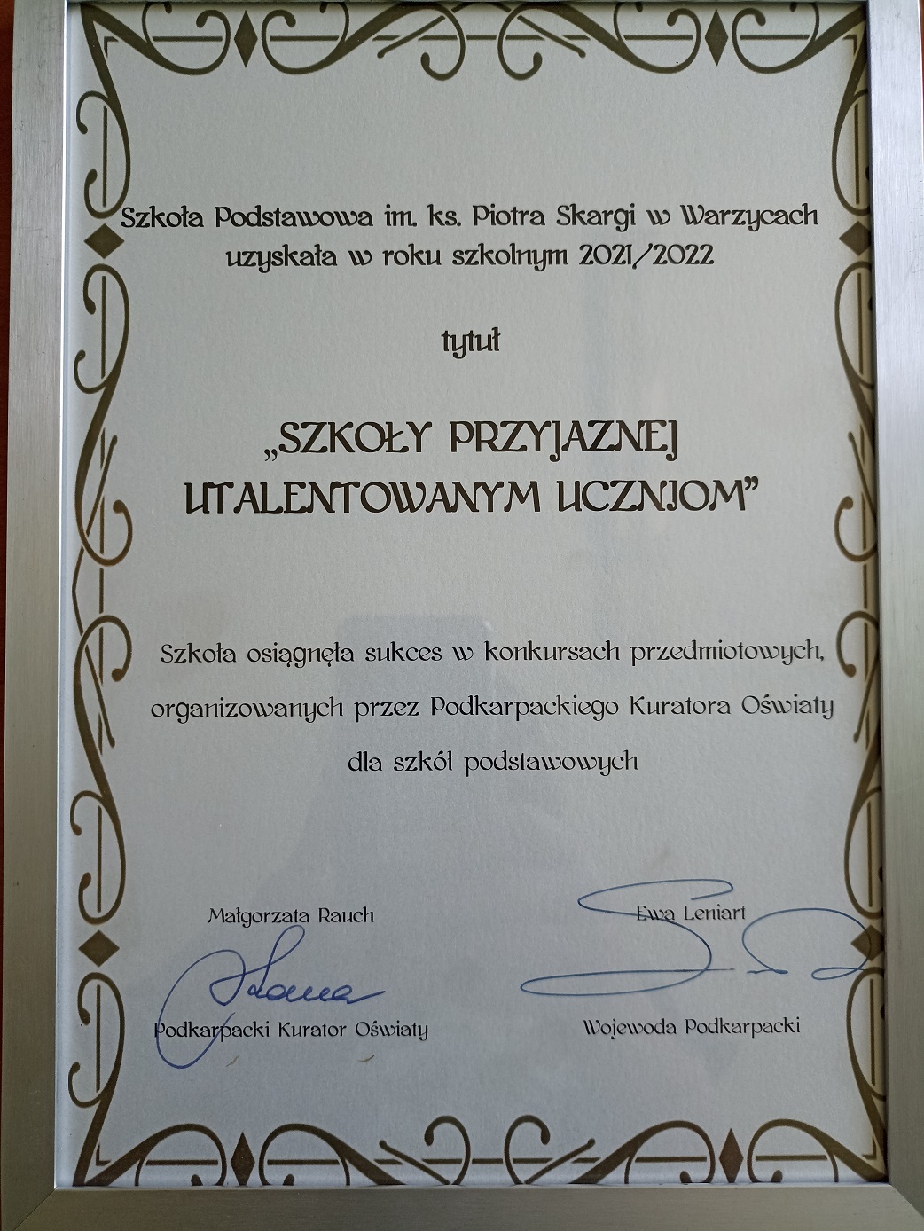 Czternaście szkół podstawowych w województwie podkarpackim zostało uhonorowanych certyfikatem „Szkoły Przyjaznej Utalentowanym Uczniom”. Miło nam poinformować, że w tym gronie znalazła się Szkoła Podstawowa im. ks. Piotra Skargi w Warzycach.