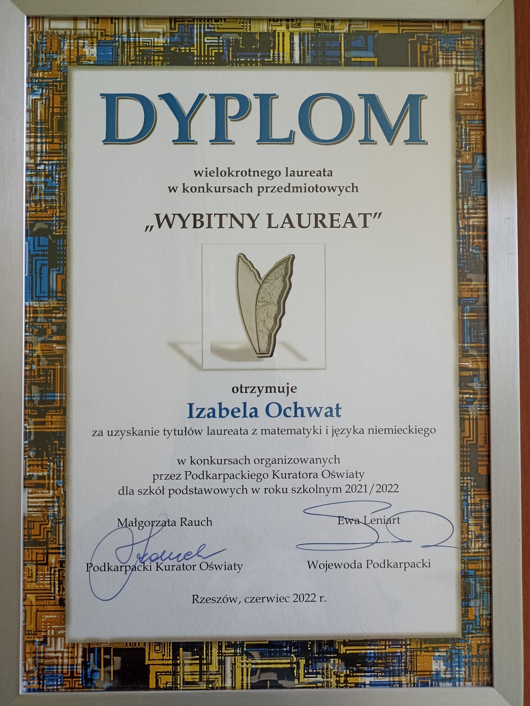 W trakcie uroczystości podsumowania tegorocznej edycji konkursów została również nagrodzona tytułem „Wybitny laureat” Izabela Ochwat - laureat konkursu matematycznego i konkursu języka niemieckiego. W tegorocznej edycji konkursów nasi uczniowie zdobyli 3 tytuły laureatów (Bartosz Wojtas-laureat konkursu historycznego, Izabela Ochwat) oraz 4 tytuły finalistów (Natalia Wietecha - język polski; Izabela Ochwat - biologia, chemia; Kamil Sanokowski - historia).