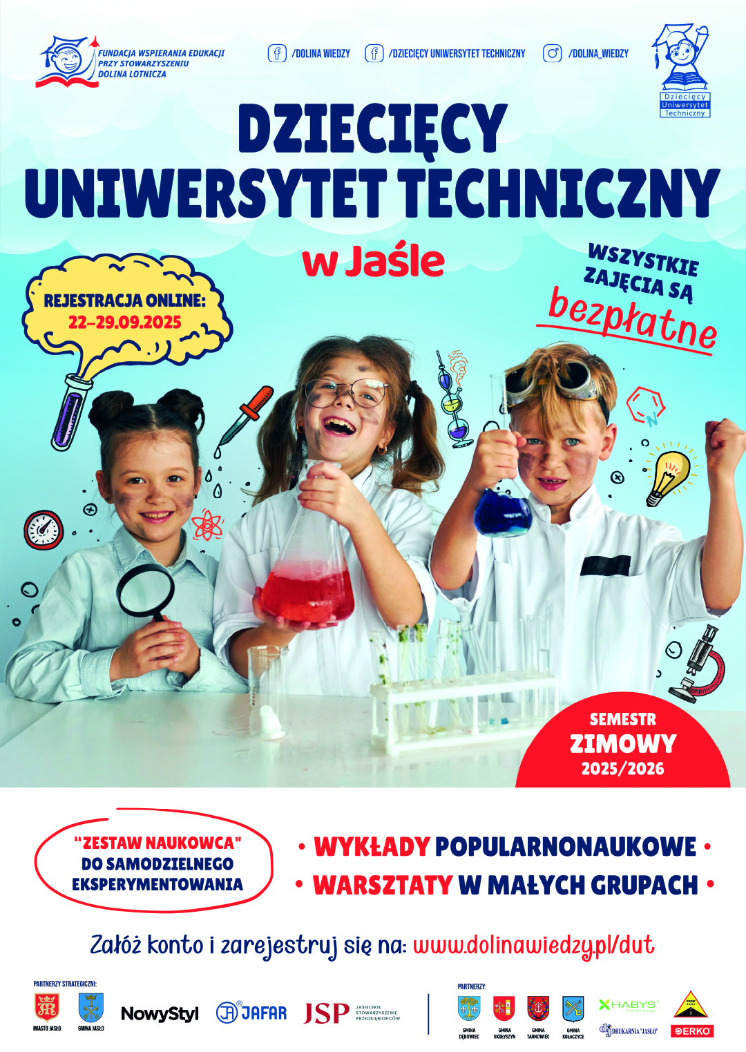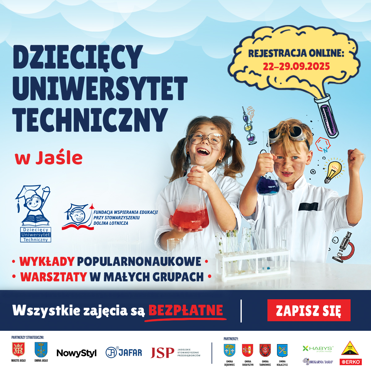 Już 22 września 2025 r. rozpoczyna się rekrutacja na Dziecięcy Uniwersytet Techniczny w Jaśle - semestr zimowy 2025/26. To wyjątkowa okazja dla dzieci w wieku 7-12 lat, zamieszkałych na terenie powiatu jasielskiego, aby odkrywać fascynujący świat nauki w formie interaktywnych wykładów i warsztatów. Zajęcia organizowane są przez Fundację Wspierania Edukacji przy Stowarzyszeniu „Dolina Lotnicza”, są całkowicie bezpłatne i odbywają się w wybrane soboty w Generatorze Nauki GEN.