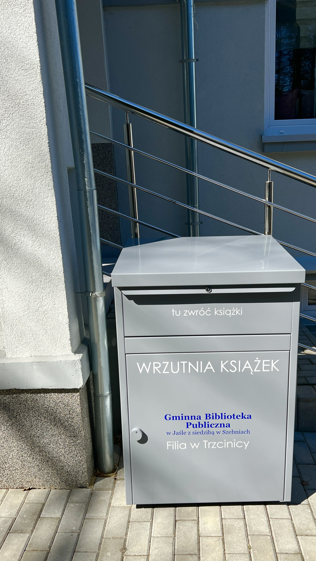Przed wejściem do budynku Biblioteki w Trzcinicy, ustawiona została WRZUTNIA KSIĄŻEK, czyli urządzenie do samodzielnego zwrotu wypożyczonych materiałów bibliotecznych.