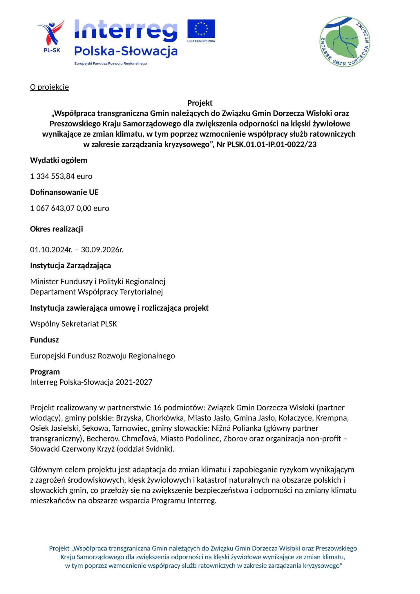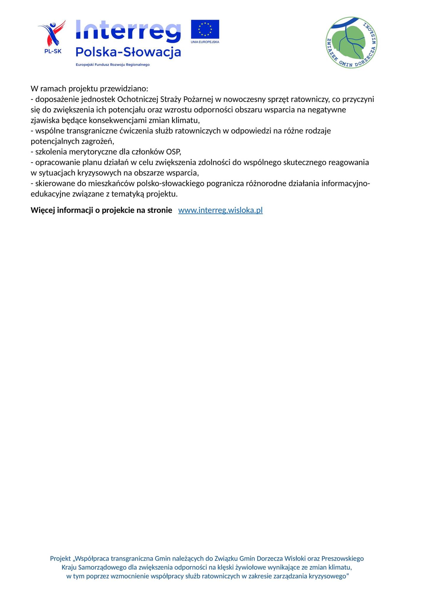 Informacja o współpracy transgranicznej Gmin należących do Związku Gmin Dorzecza Wisłoki oraz Preszowskiego Kraju Samorządowego dla zwiększenia odporności na klęski żywiołowe wynikające ze zmiany klimatu, w tym poprzez wzmocnienie współpracy służb ratowniczych w zakresie zarządzania kryzysowego" Nr PLSK.01.01-IP.01-0022/23.