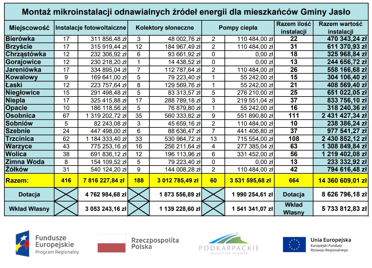 Gmina Jasło zakończyła realizację projektu „Montaż mikroinstalacji odnawialnych źródeł energii dla mieszkańców na terenie Gminy Jasło”. Łączna wartość inwestycji to 14 360 609,01 zł, w tym dotacja ze środków UE: 8 626 796,18 zł. Na terenie gminy wykonane zostały łączenie 664 instalacje OZE w tym: 416 instalacji fotowoltaicznych za kwotę 7 816 227,84 zł, 188 instalacji kolektorów słonecznych za kwotę 3 012 785,49 zł i 60 pomp ciepła za kwotę 3 531 595,68 zł.