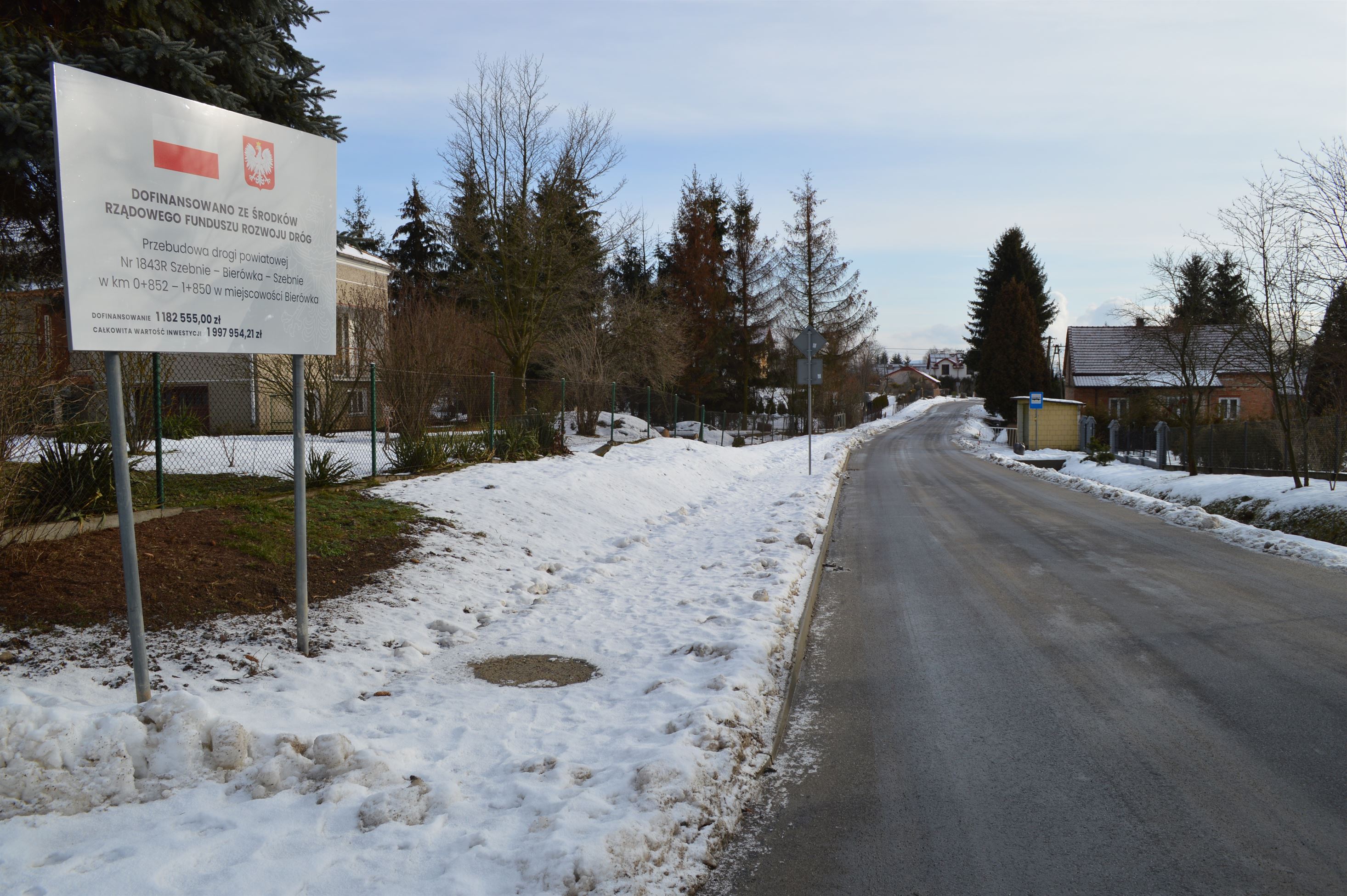 W ramach realizacji zadania pn. ,,Przebudowa drogi powiatowej Nr 1843R Szebnie - Bierówka - Szebnie w km 0+852 - 1+850 w miejscowości Bierówka” zmodernizowano kilometrowy odcinek drogi, która przebiega przez teren mocno zurbanizowany - od skrzyżowania w centrum Bierówki w kierunku Szebni.